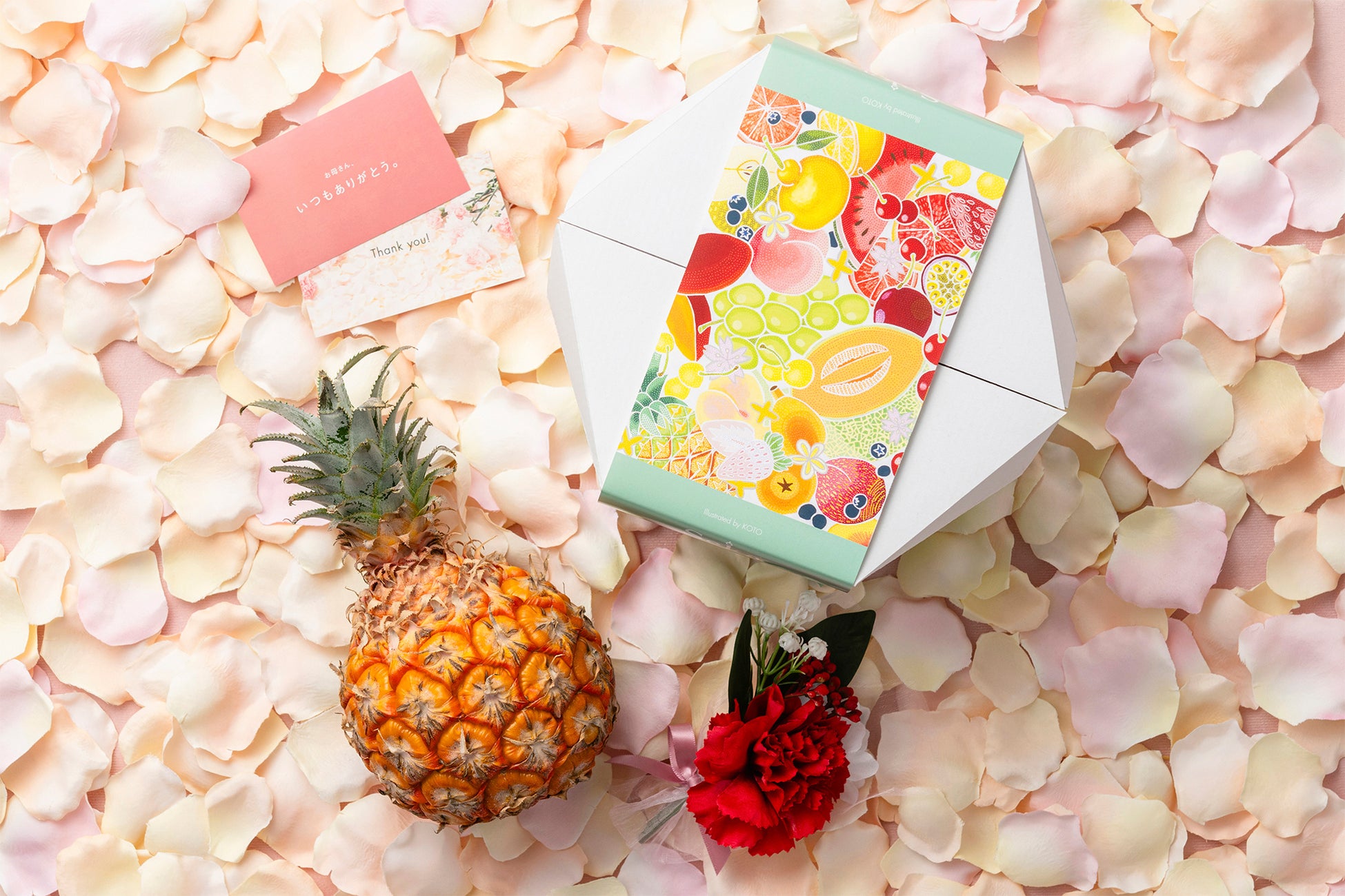 また、2年ぶりに再登場する、いちごやさくらんぼに加えカーネーションなどの花を宝石のように敷き詰めたお重セットをはじめ、本年新発売のいちごを花のように美しく仕立てたお手頃価格のギフトや、手でちぎって手軽に楽しめるスナックパインなど、母の日にふさわしい多彩な商品を展開。母の日限定で、感謝の気持ちを伝えるメッセージカードとブーケを添えたギフトもご用意しています。