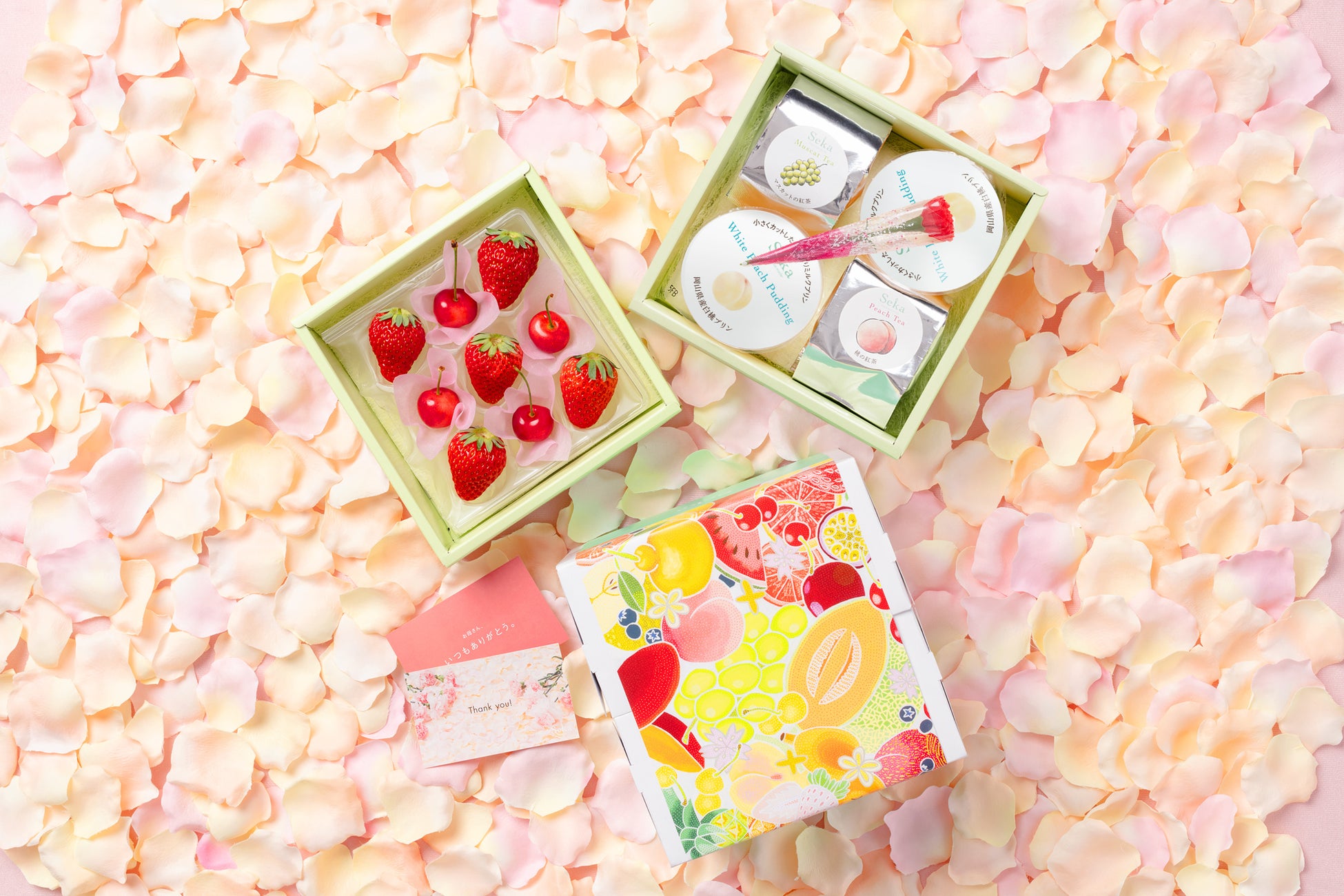 上段にはいちごとさくらんぼ、下段には岡山白桃プリン4個とフルーツティー2種を詰め合わせた新発売のお重セット。白桃プリンは、ピューレに加え刻んだ果肉もたっぷり使用し、フルーティーな甘みとミルクのコクが調和した味わいに仕上げました。マスカットとピーチのフルーツティーは、ホットでも水出しでもお楽しみいただけます。感謝の気持ちを伝えるミニカーネーションと母の日カードを無料でお付けいたします。