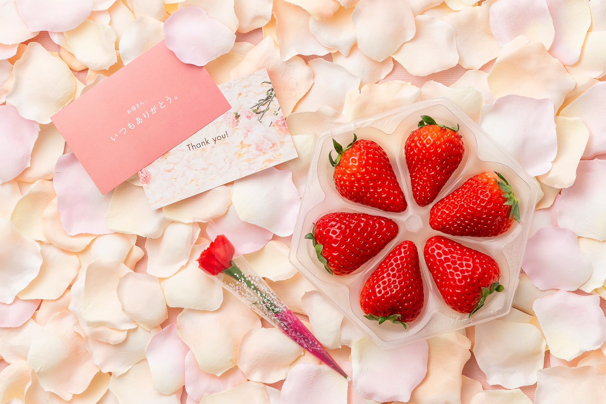 世代を問わず人気のいちごを、花の形に美しく仕立てた新商品。見た目の華やかさはもちろん、いちご本来のおいしさを楽しめるよう、この時期に最適な上質ないちごを厳選してお届けします。感謝の気持ちを伝えるミニカーネーションと母の日カードを無料でお付けいたします。
