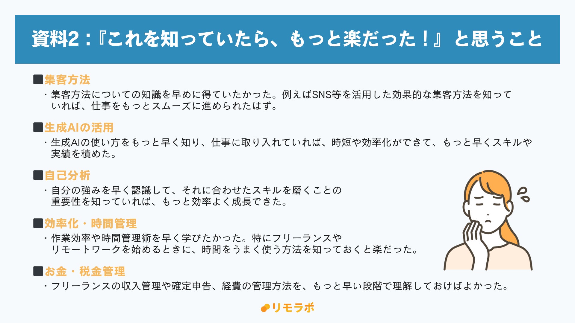 自由回答にて「あなたの仕事において『これを知っていたらもっと楽だった!』と思うことは?」と聞いたところ、自分の強みを早く認識し、それに合わせたスキルを磨くことの重要性を感じている人が一定いた他、生成AIの使い方をもっと早く知り、仕事に取り入れることで時短や効率化が可能になり、より早くスキルや実績を積めたという意見が多く見られました(資料2)