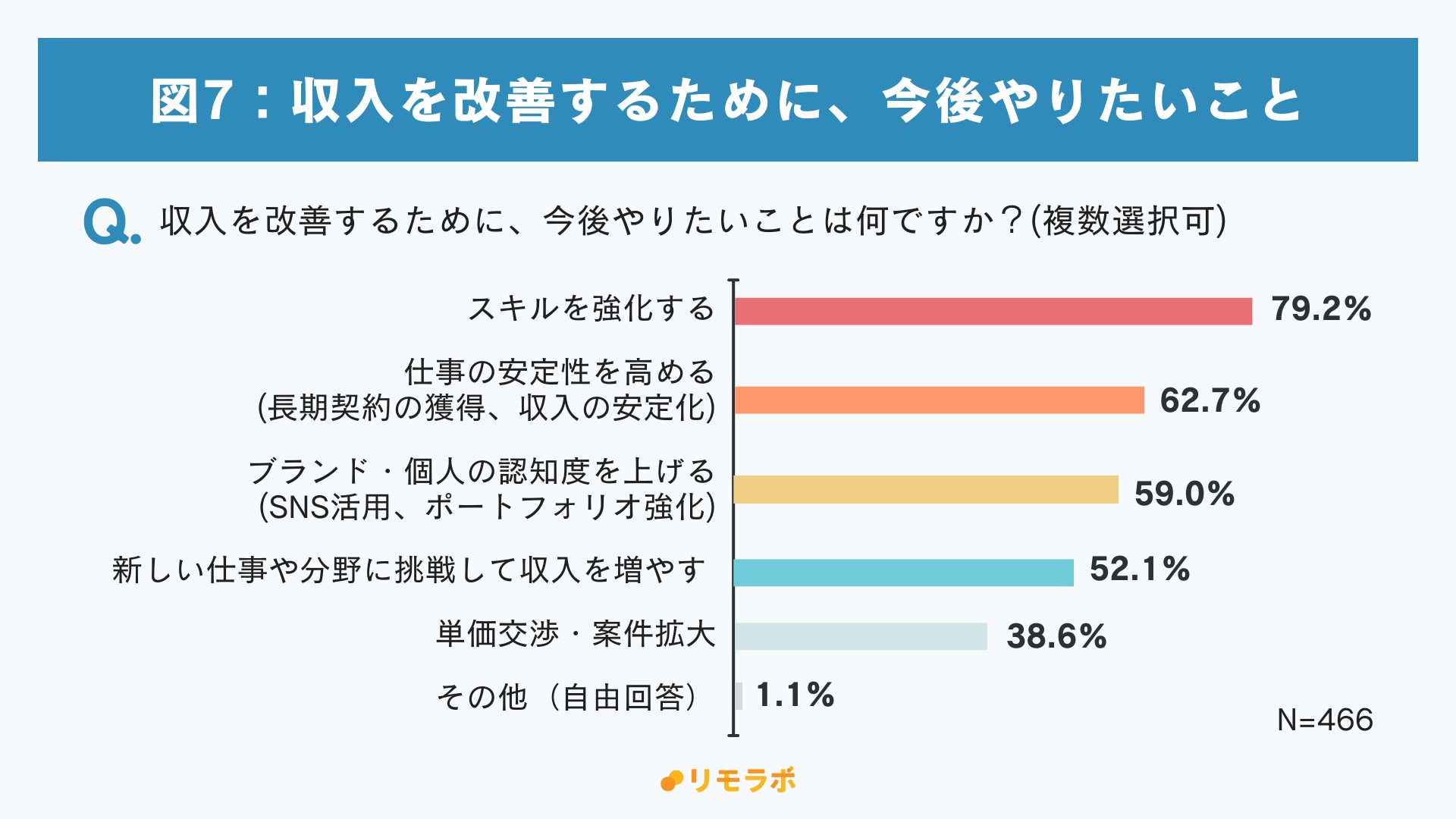 今後、収入を改善したいと回答した方が実施したいこととしては、「スキルを強化する」が79.2%で最多。次いで「仕事の安定性を高める(長期契約の獲得、収入の安定化)(62.7%)」、「ブランド・個人の認知度を上げる(59%)」が続きました。すでに案件を獲得しているからこそ、さらなるステップアップに向けた動きを考えている人が多いことがうかがえます(図7)。