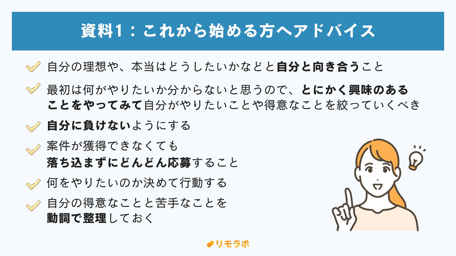 さらに、「フリーランスや副業を始める時期に戻れるなら、どんなアドバイスを自分にしますか?」と聞いたところ、「早く行動し、迷っている時間を減らすべき。」や「失敗を恐れずにどんどんチャレンジすることが重要。」といった声がありました。新生活の時期、ぜひ迷っている方はまず一歩踏み出してみませんか(資料3)。