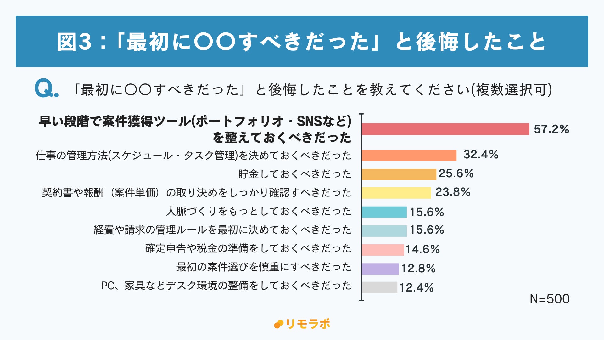 また、「最初に〇〇すべきだった」と後悔したことの中で最も多かったのは、「早い段階で案件獲得ツール(ポートフォリオやSNSなど)を整えておけばよかった」(57.2%)という声でした。案件獲得に苦戦した方が多いことからもわかる通り、案件を獲得するための準備が最も重要だということが伺えます。さらに、「仕事の管理方法(スケジュール・タスク管理)を決めておくべきだった」(32.4%)、「契約書や報酬(案件単価)の取り決めをしっかり確認すべきだった」(23.8%)という意見も多く見られ、フリーランスや副業ならではの後悔が浮き彫りになりました(図3)。