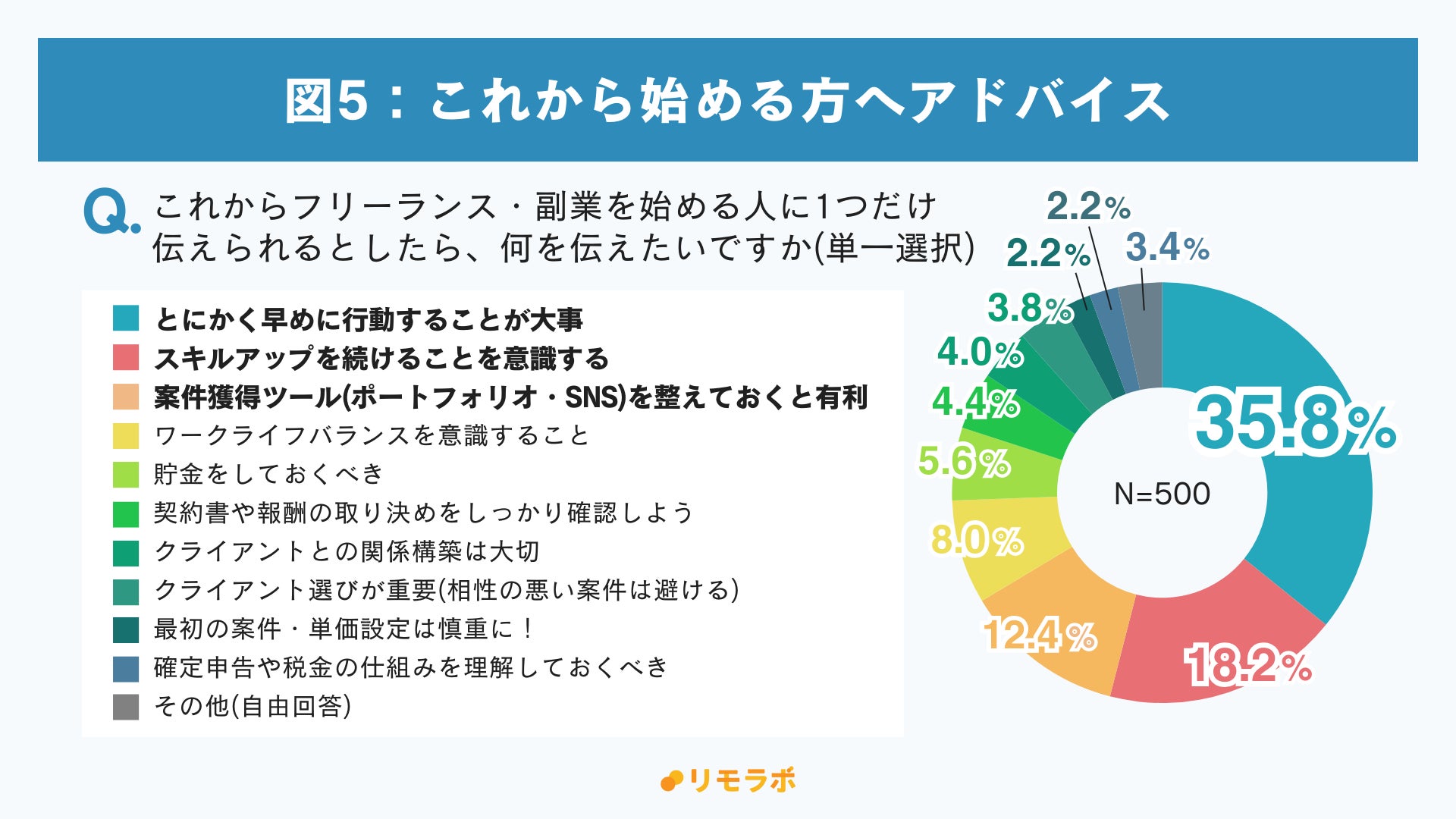 また、「これからフリーランスや副業を始める人に1つ伝えられるとしたら」との質問に対し、「とにかく早めに行動することが大事(35.8%)」という回答が最も多く、続いて「スキルアップを続けることを意識する(18.2%)」、「案件獲得ツール(ポートフォリオ・SNS)を整えておくと有利(12.4%)」が挙げられました。多くの人が、成功するためには早期の行動やしっかりとした準備が欠かせないと実感していることがわかります(図5)。他にも、案件を始める前に自分がやりたいことや目的を明確にすべきという声や落ち込まないで行動していくべきという意見も見られました(資料1)。