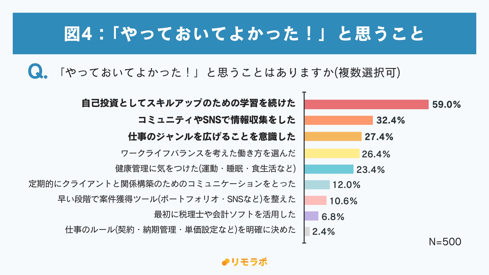一方で、現在収入を得ているフリーランスや副業の方が「やっておいてよかったこと」として挙げたのは、1位「自己投資としてスキルアップのための学習を続けた(59%)」、2位「SNSでの情報収集(32.4%)」、3位「仕事のジャンルを広げることを意識した(27.4%)」という結果に。これにより、フリーランスや副業を成功させるためには、自身のスキルや可能性を広げること及び情報収集が重要な要素となっていることが明らかになりました(図4)。