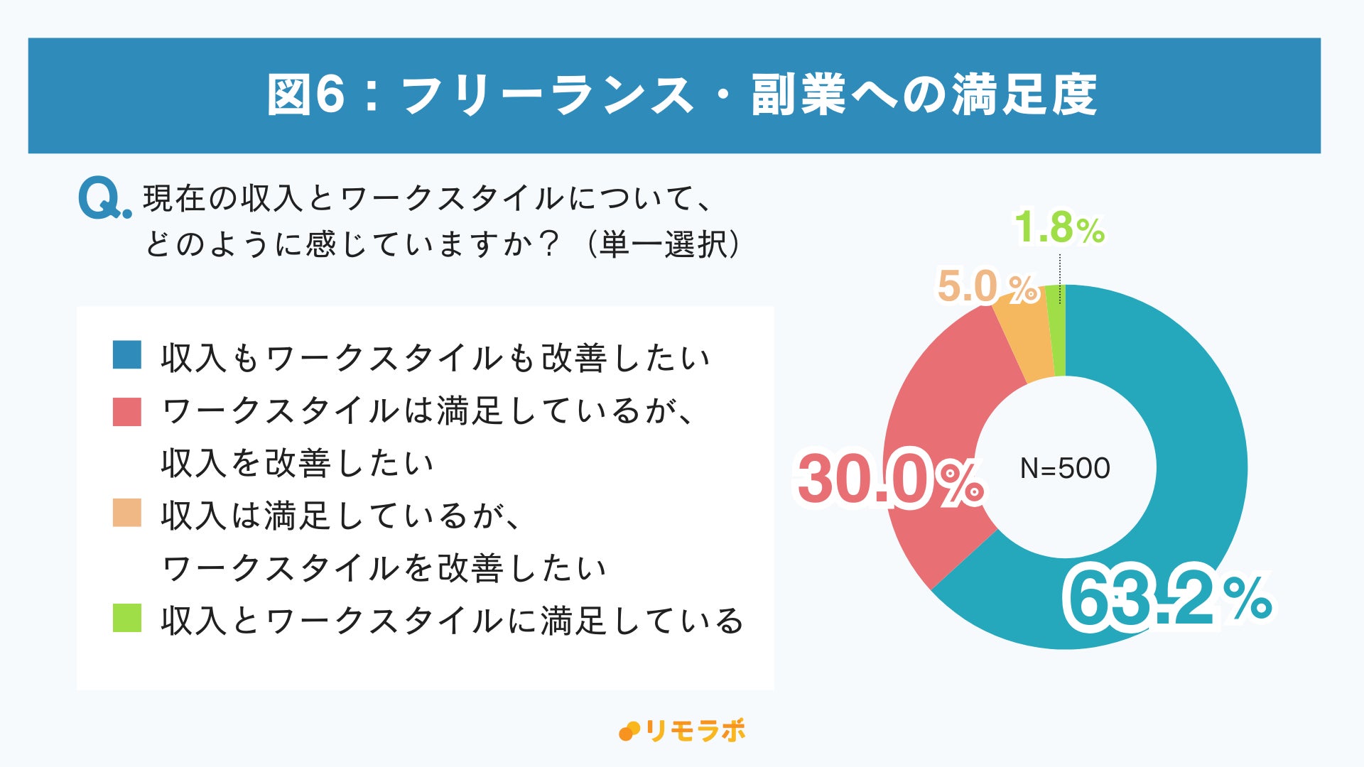 「現在の収入とワークスタイルについて、どのように感じていますか?」と聞いたところ、収入を得ていても63.2%の人が「収入もワークスタイルも改善したい」と考えていることが分かりました。一方で、約3人に1人は収入には改善の余地があるものの、ワークスタイルには満足していると感じており、収入とワークスタイルの両面で改善を目指す動きがある中でも、ワークスタイルには一定の満足感を持つ人も少なくないという結果となりました(図6)。
