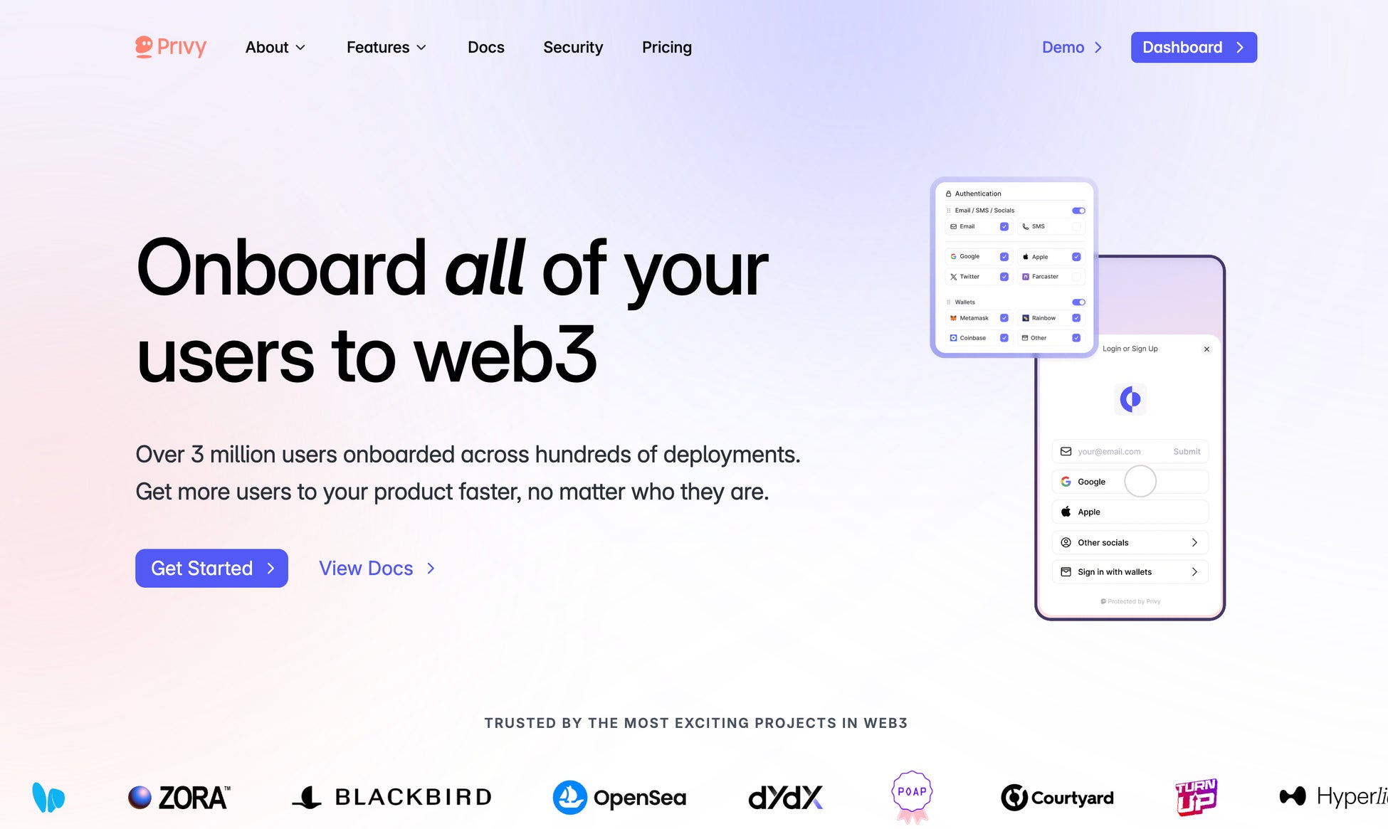 「Privy」は、数分で優れた認証フローを追加し、ウォレットの有無にかかわらず、モバイルとデスクトップのすべてのユーザーにサービスを提供します。脆弱なウォレットコネクタの扱いに悩まされることはなくなり、ユーザーが接続しているかどうか、どのチェーンにどのウォレットを使用しているかを心配する必要がなくなります。わずか数行のコードで、ウォレットの有無にかかわらずすべてのユーザーを安全にオンボードし、開発者は開発に集中できるようになります。
