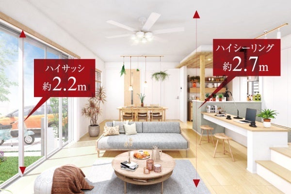 リビングの天井は約2.7m高を確保。約2.2mのハイサッシと相まって、明るい空間を演出しています。