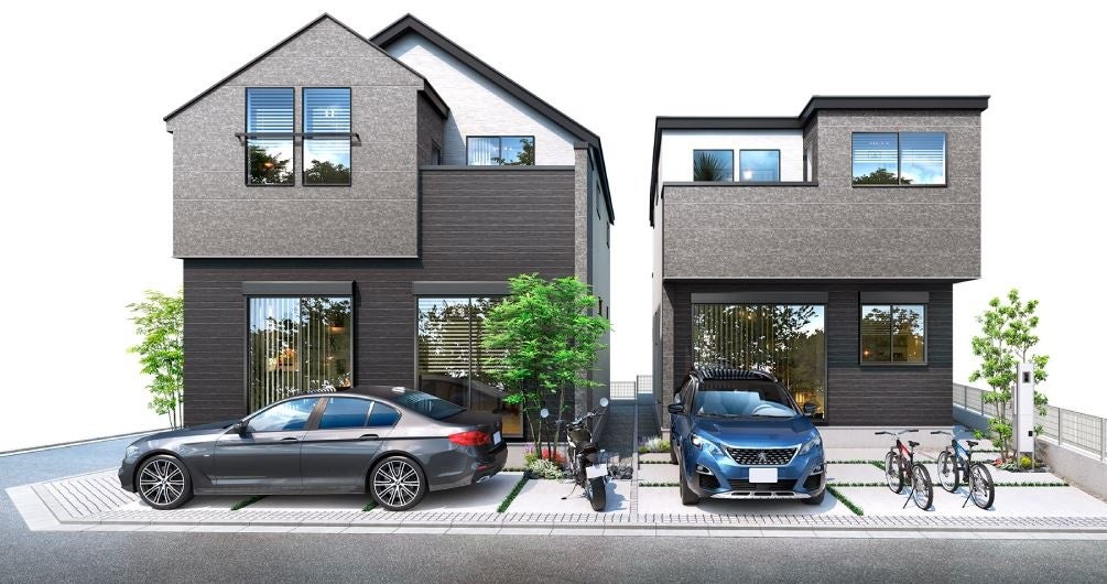 それぞれの住まいを異なる外壁材や屋根形状にすることで、外観デザイン・シルエットに違いをつけています。現地は第1種低層住居専用地域に位置し南西角地を含む全邸南道路に面しているため、陽当たりが良く、採光性に優れています。