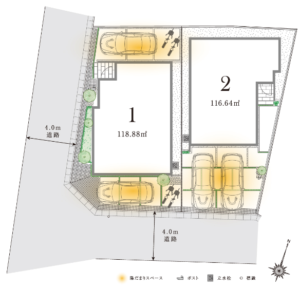 夜間は各邸の外部灯が点灯し街並みをライトアップ。街の安全性や防犯性を高め、美しい景観を演出します。