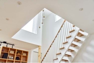 リビングは開放感のある吹抜天井を採用し、吹き抜けの壁面上部には、自然光を採り込む窓を設置しました。