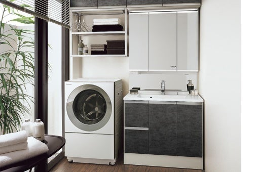 洗面室は1,5坪の広さに1,200mmのワイド洗面化粧台とガス衣類乾燥機の「乾太くん」を標準装備。毎日使用する場所だからこそ、生活を豊かにする工夫を凝らしました。