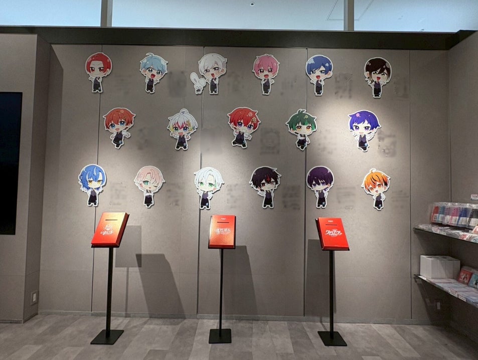 大阪店の店内には、ファンの皆さん必見の特徴的なディスプレイが多数登場しています。特に注目すべきは、「いれいす」「すたぽら」「クロノヴァ」メンバーのデフォルメイラストとメッセージが描かれた壁面。メンバーたちの可愛らしい姿を描いたこの壁面は、まさにフォトスポット。推しとともに、記念撮影をしたくなること間違いなしです。