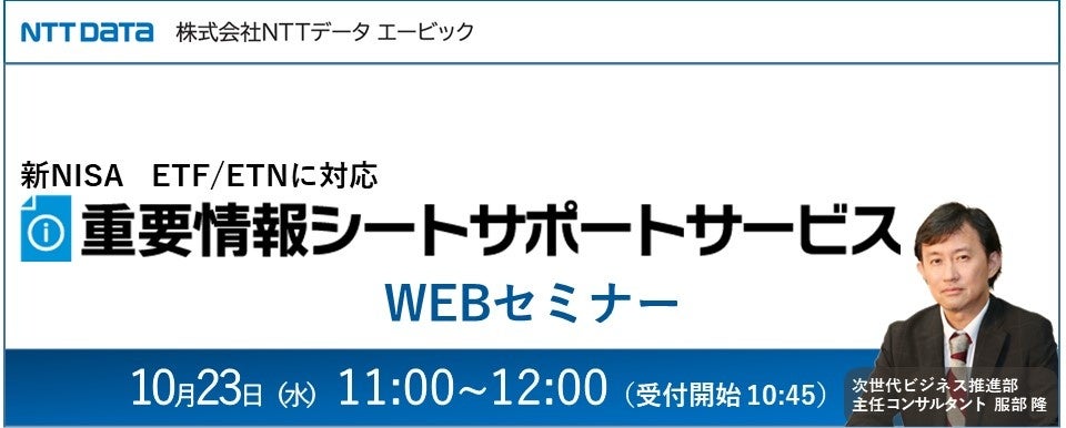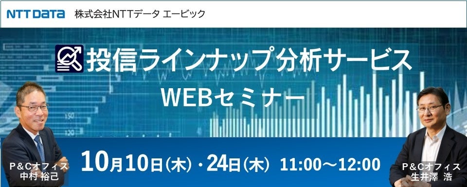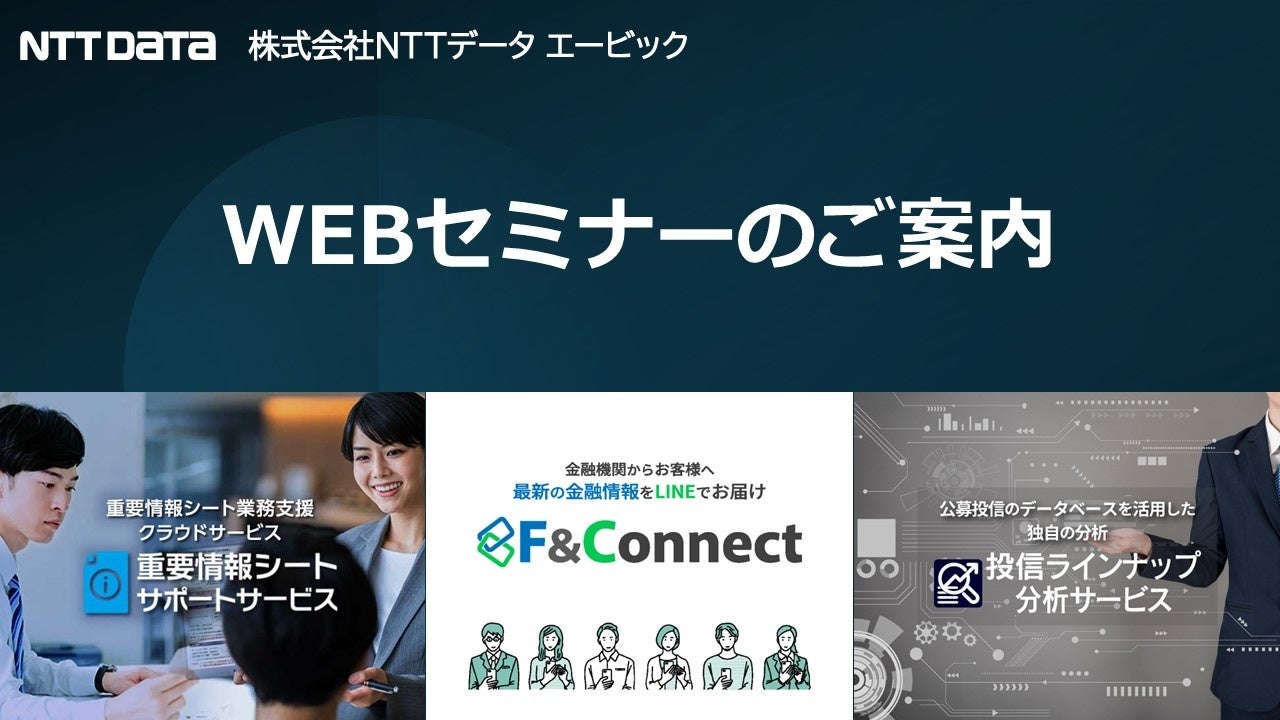 株式会社NTTデータ エービック(本社:東京都港区、代表取締役社長 大谷 温仁、以下「当社」)、金融機関様の投資信託販売を支援する当社サービスに関するWEBセミナーを随時開催しています。10月は新サービス2つを含む、3つのWEBセミナーを開催します。