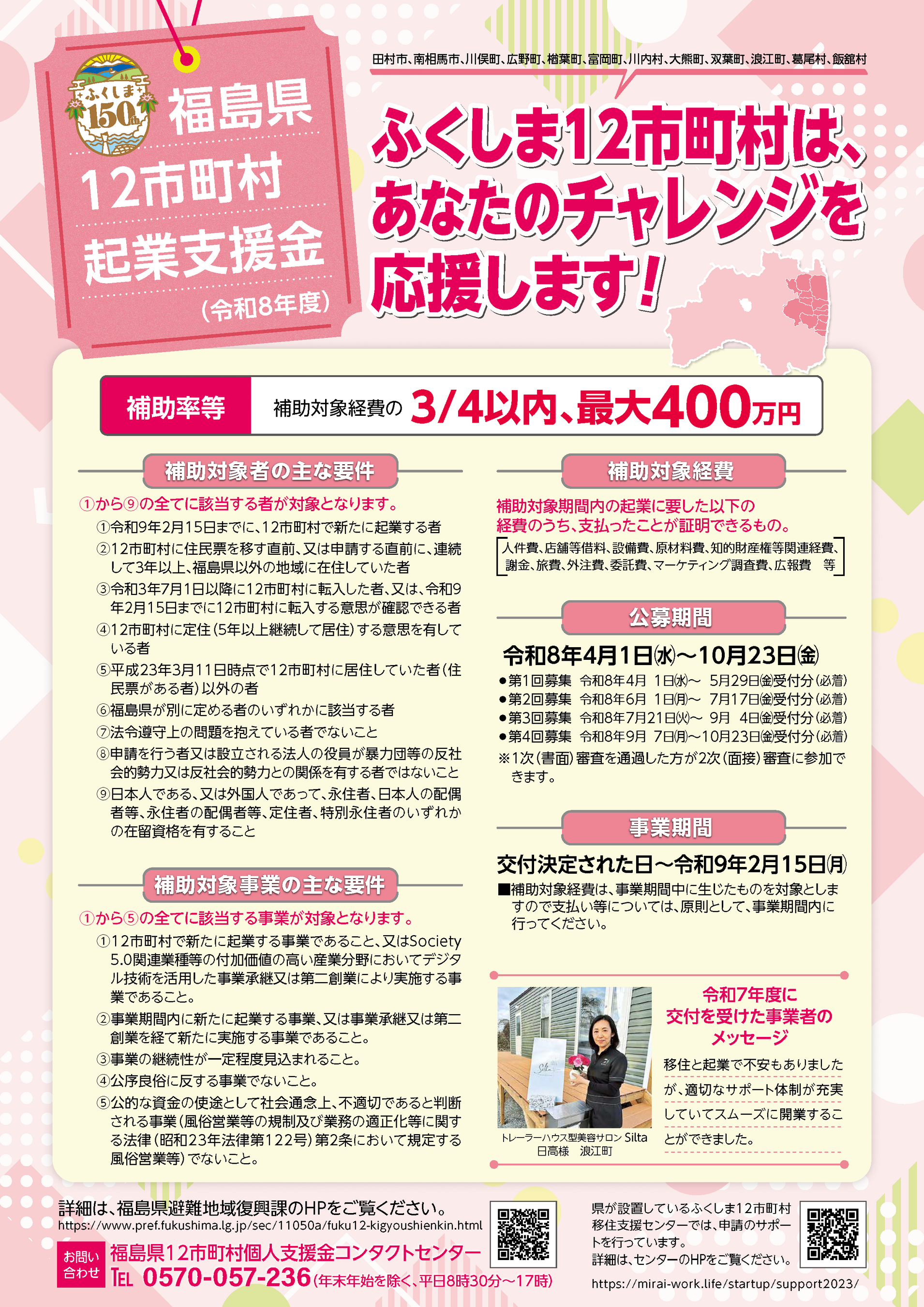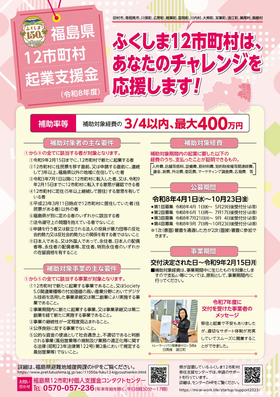 【福島県】令和8年度「福島県12市町村起業支援金」の募集を開始しました!