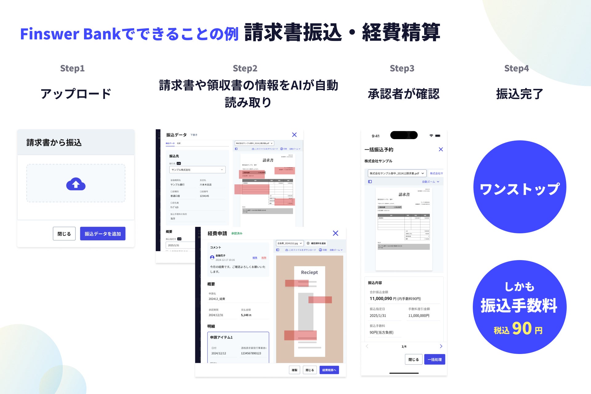 Finswer Bank上では、請求書やレシートの内容を AI が自動で読み取り、振込・精算まで 完結させることができる他、インボイス制度に対応した請求書を発行した上で、入金記録と突合する入金消込を行うことができます。これらの帳票類にはタイムスタンプを付与する方法等により、電子帳簿保存法の要件を満たす形で保存することもできます。