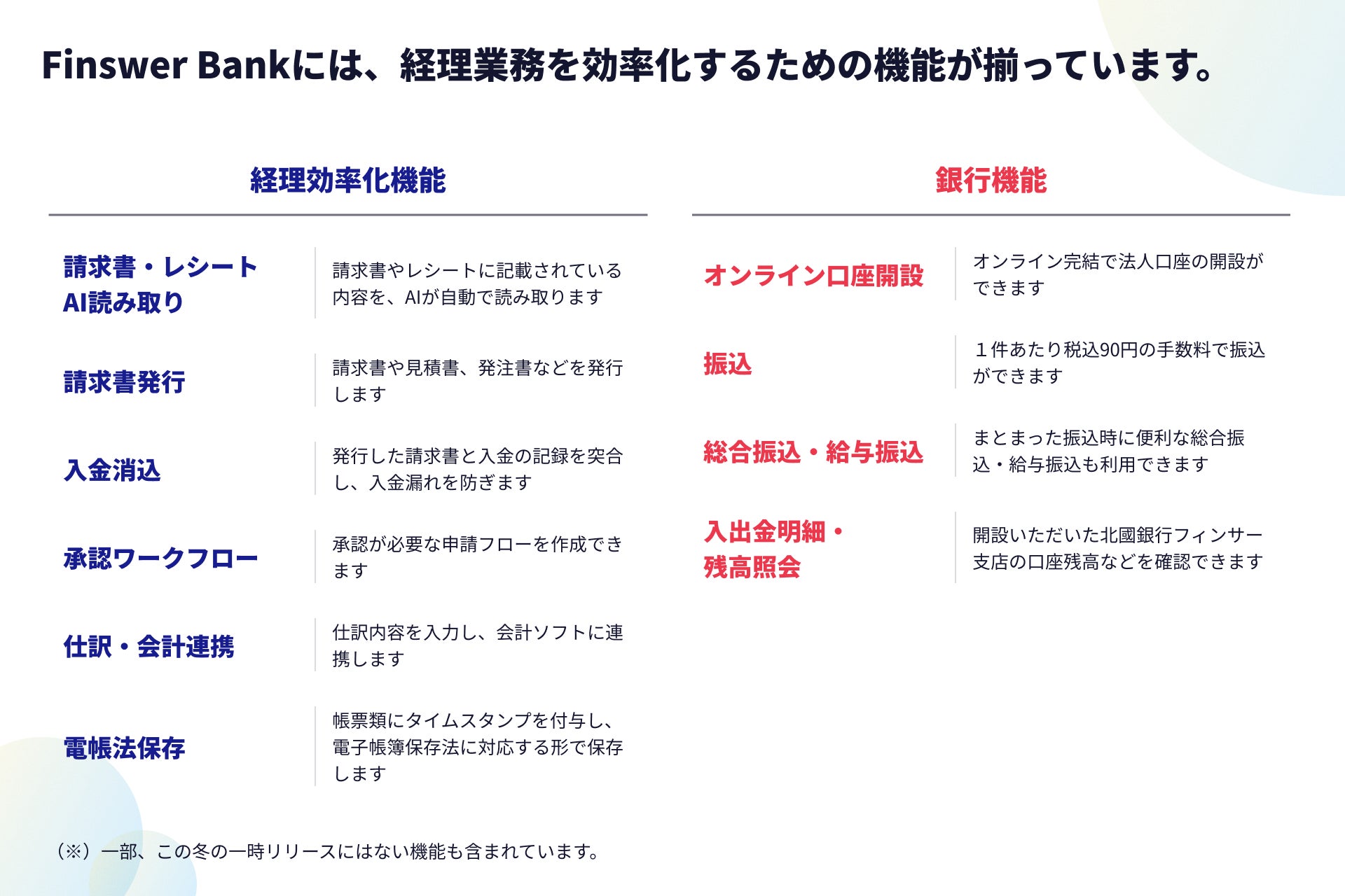 Finswer Bankは、請求書や経費にまつわる業務をワンストップで効率化するオンラインバンク(※2)です。「北國銀行フィンサー支店」の口座を開設することで、Finswer Bankをご利用いただくことができます。