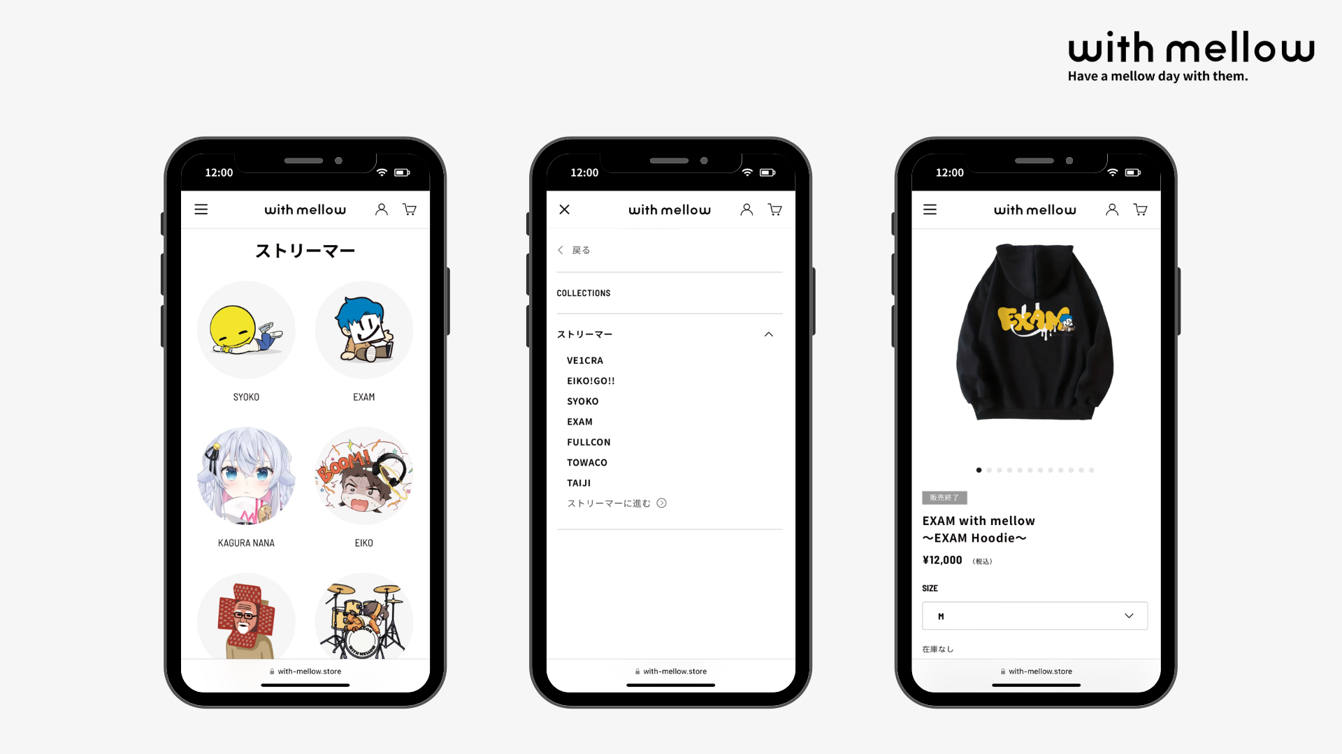 『with mellow Store』では、お客様が好きなクリエイターを中心に商品を探せるよう、クリエイターたちのアイコンから商品を探すことができます。クリエイターごとのアイテムやデザインを楽しみながら、直感的にショッピングをお楽しみいただけるサイトとなっております。
