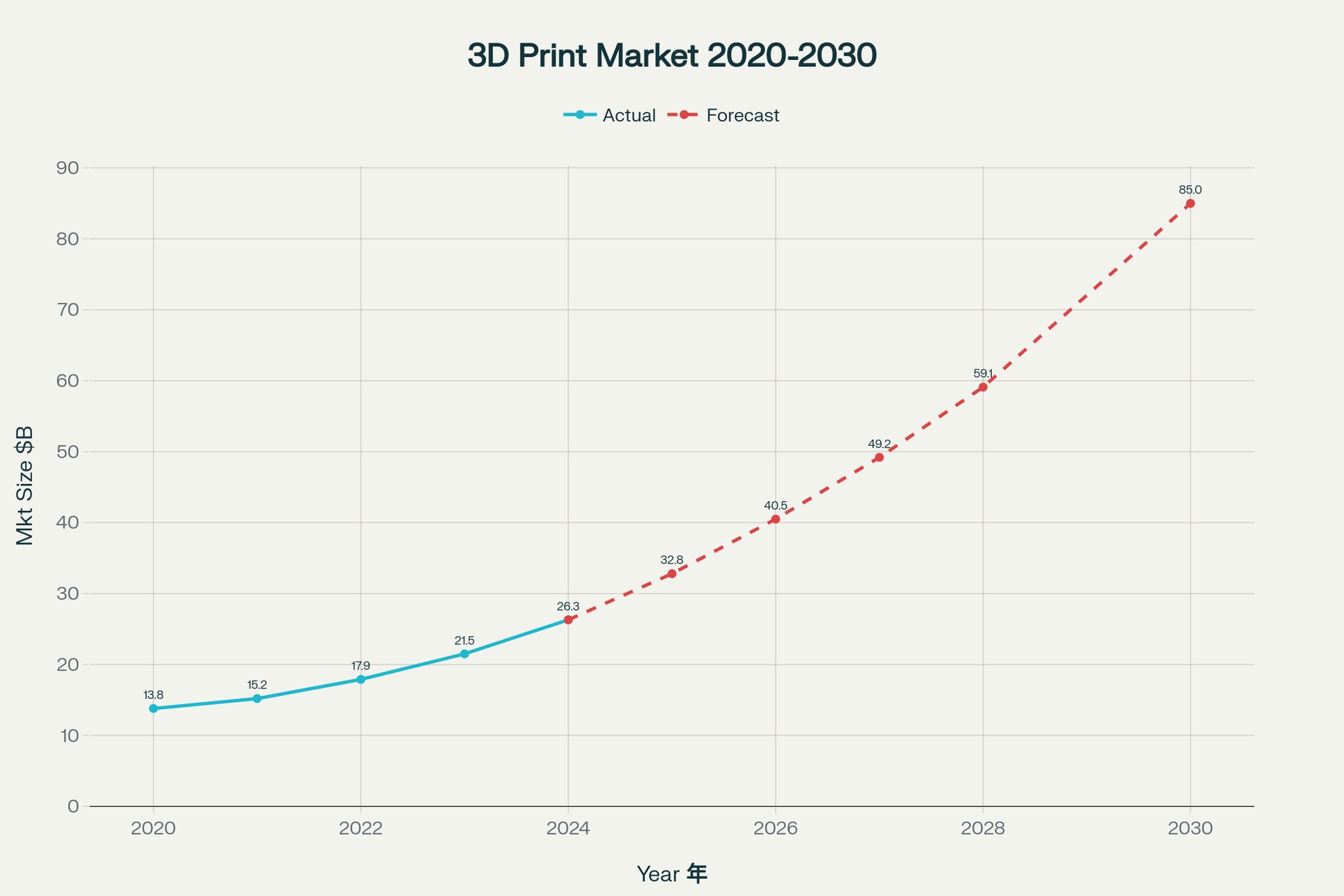 3Dプリンティング・積層造形産業は現在、歴史的な成長局面を迎えている。過去の市場規模は2020年に138億ドルであったが、2030年には実に850億ドルへ達すると予測されており、この間の年平均成長率は20%を超える水準である。このような急速な成長を支えている背景には、製造業における自動化への強い需要、消費市場におけるマスカスタマイゼーション志向の定着、そして世界的な持続可能性への社会的要請という三つの強力なドライバーが存在している。