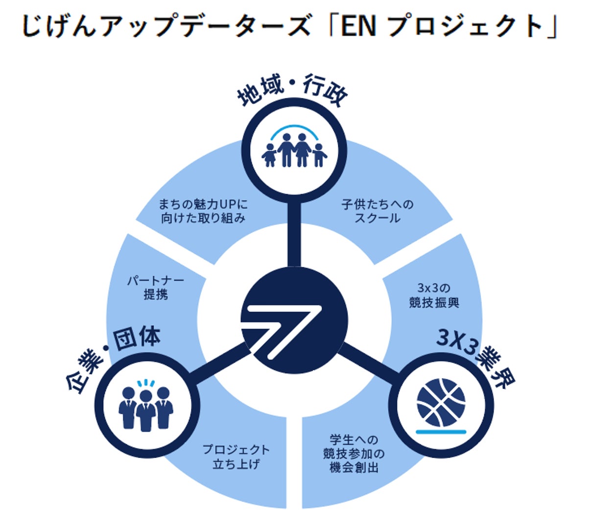 じげんアップデーターズでは、チームスローガン「UPDATE the YOUTH -若者の挑戦を応援-」のもと、チームの活動を通じて関わる多くの皆さまとのご縁を大切に、持続的な地域の発展、挑戦機会の創出などを目的とした『EN プロジェクト』を開始しています。プロジェクトを通じて、より3x3の競技やチームを知っていただけるきっかけにもなるような、さまざまな取組みを行ってまいります。京都市を中心とした、様々な企業や団体のパートナーの皆様の協力を得ながら、本プロジェクトの推進を進めてまいります。