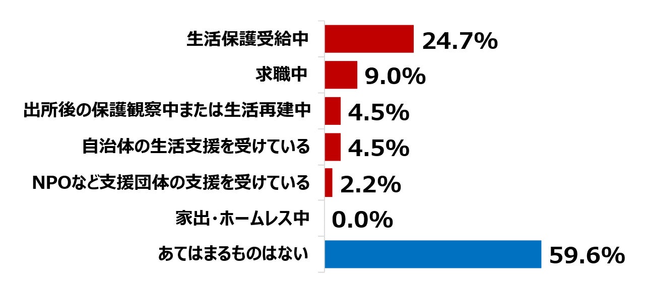 基本属性から決しで豊かな生活ではない若年層の利用者の方々ですが、生活の困窮度合について聞いてみました。その結果、72.0%と約7割の方々がなんらか生活に困っている実態が明らかに。約3割は「非常に困っている」「かなり困っている」という厳しい状況です。さらに生活状況について掘り下げて聞いたところ、4人に1人となる24.5%が「生活保護受給中」であることもわかりました。