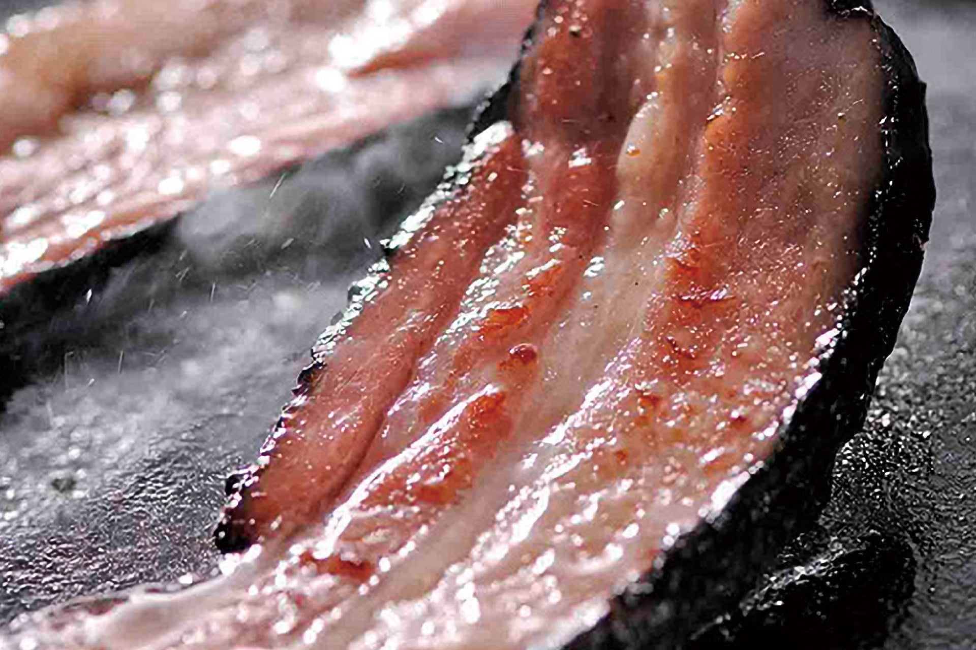 豚ばら肉に、塩などをすり込む昔ながらの「乾塩法」という手間暇のかかる製法で調味し、乾燥・熱処理で外面を黒く仕上げました。カットした時の断面の肉色と外面色のコントラストは他のベーコンにはないバルナバ品質です。