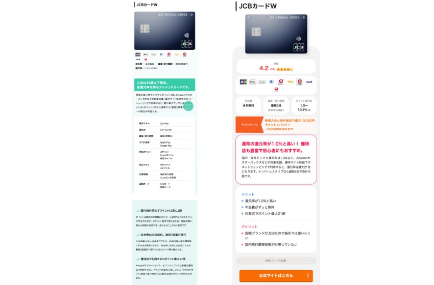 年会費やポイント還元率といった基本情報やクレジットカードの特徴も、ぱっと見で分かりやすいデザインに変更しております。