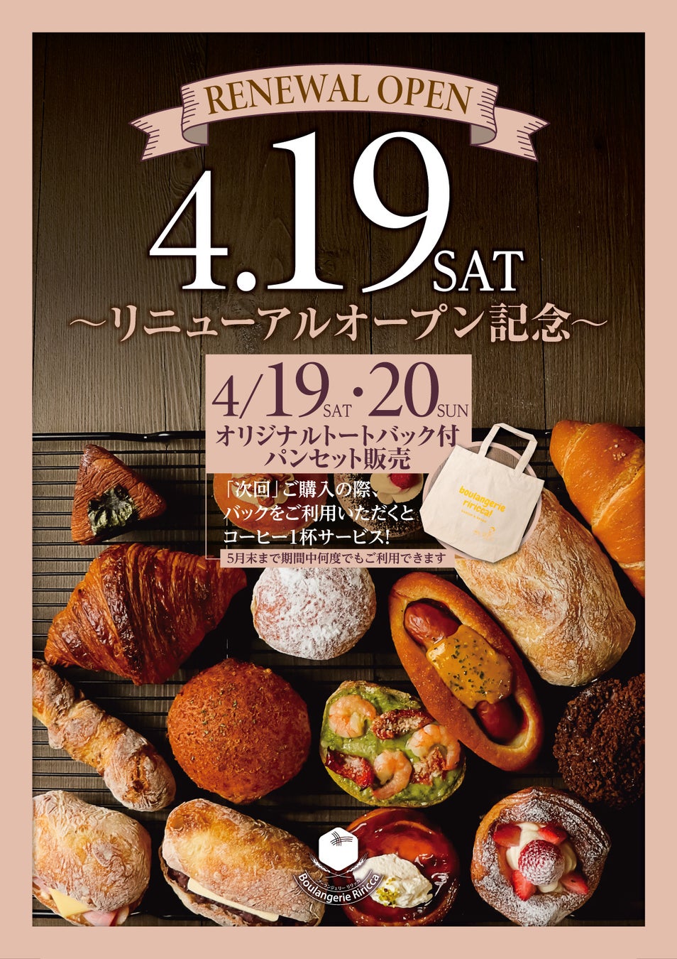 『ブーランジェリー リリッカ』では、リニューアルオープンを記念して、2025年4月19日(土)・20日(日)の2日間限定で、オリジナルトートバック付きのパンセットを販売します。次回、パンをご購入の際にこのトートバックをご持参いただきますと、コーヒーを1杯サービスします。コーヒーは店内イートインのほか、テイクアウトも可能です。2日間限定での販売ですので、ぜひお見逃しなくご来店ください。