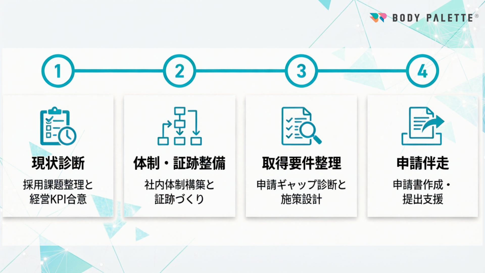 認定取得のための申請実務に加え、採用チャネルでの訴求実装までを含め、採用ROIの改善に直結する運用設計を行います。