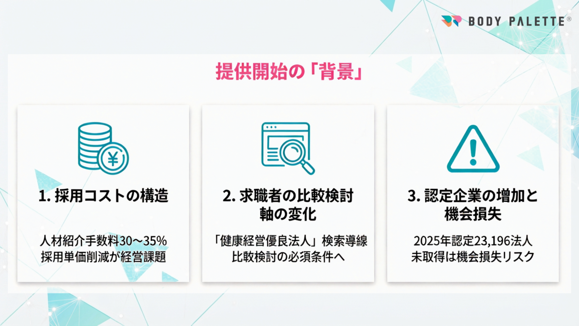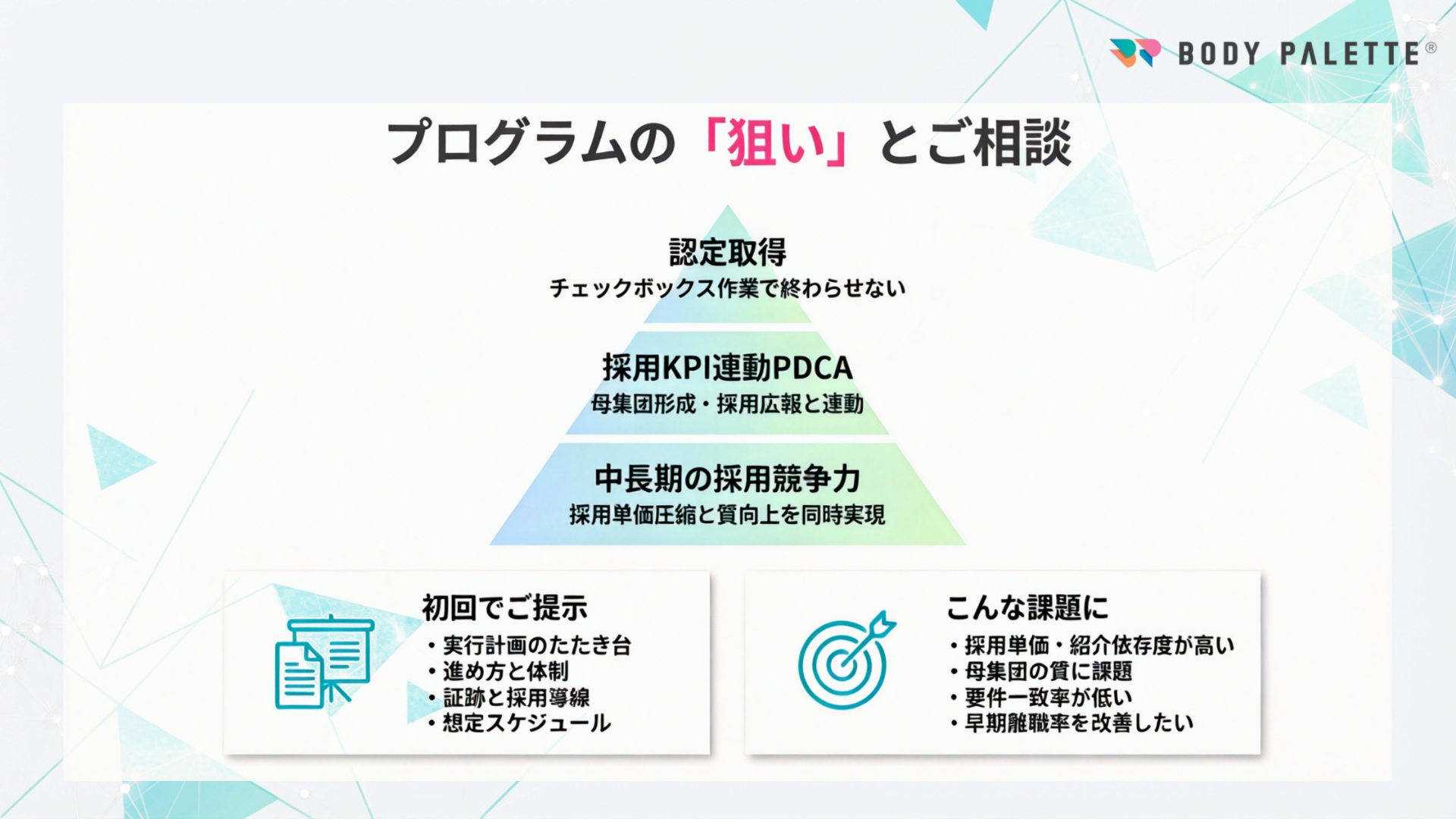 本プログラムは、健康経営優良法人の認定取得・更新を、採用戦略と経営戦略に連動させて運用することで、採用単価の圧縮と応募の質の向上を同時に実現することを狙います。