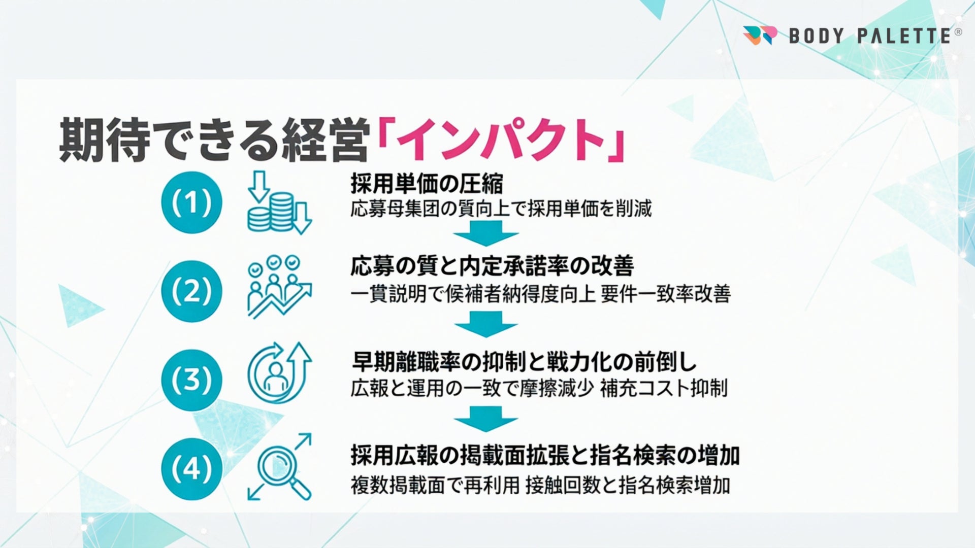 具体的には、求人票の訴求軸、募集要件の表現、会社説明資料、採用サイト、SNS、面接官トークの一貫性を整備し、応募の質(要件一致率)を上げることで、採用単価の圧縮を狙います。