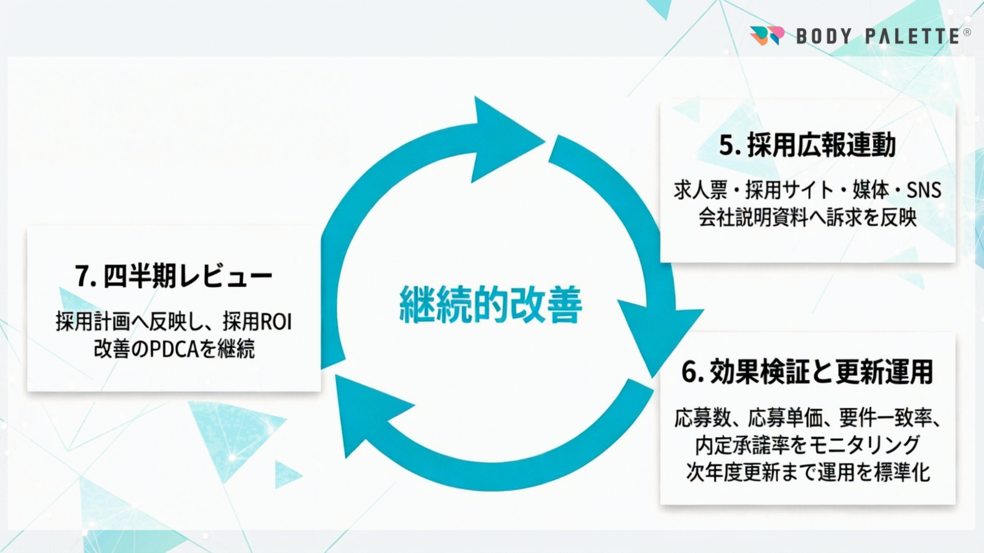 5)採用広報連動:求人票、採用サイト、媒体、SNS、会社説明資料、面接官トークへ訴求を反映
