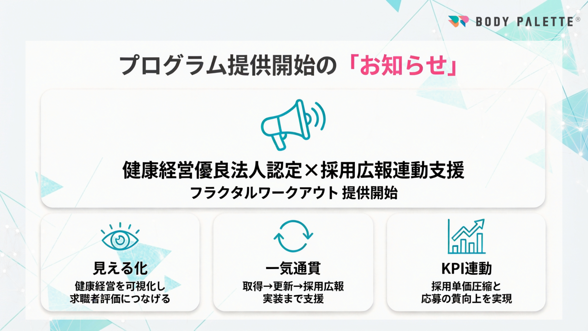 フラクタルワークアウト株式会社(本社:東京都渋谷区、代表取締役:高瀬雅弘、以下 当社)は、採用戦略と経営戦略に連動した「健康経営優良法人認定取得・更新と採用広報連動支援プログラム」の提供を開始しました