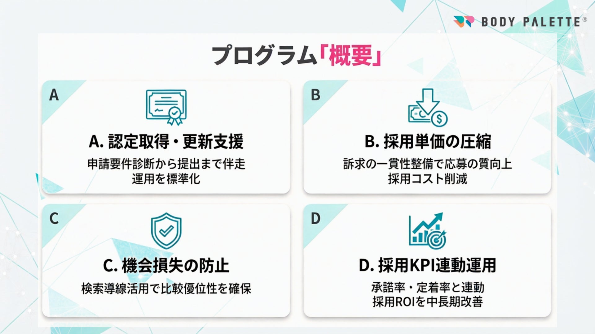 本プログラムでは、認定取得をゴールにせず、採用単価の圧縮、応募母集団の量と質の改善、要件一致率の向上、早期離職率の低減といった採用KPIと連動させ、取得から更新、採用広報への実装までを一気通貫で支援します。