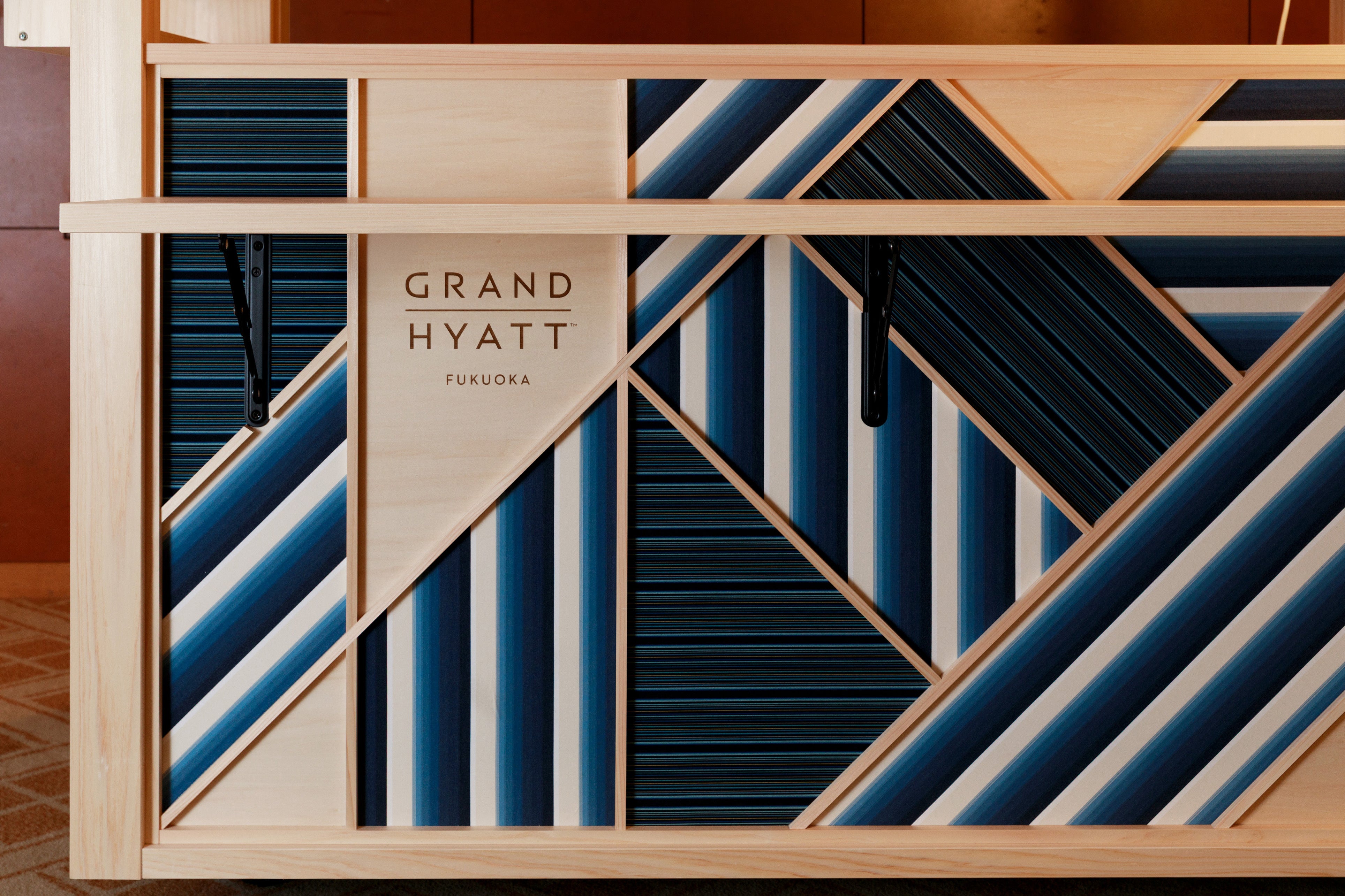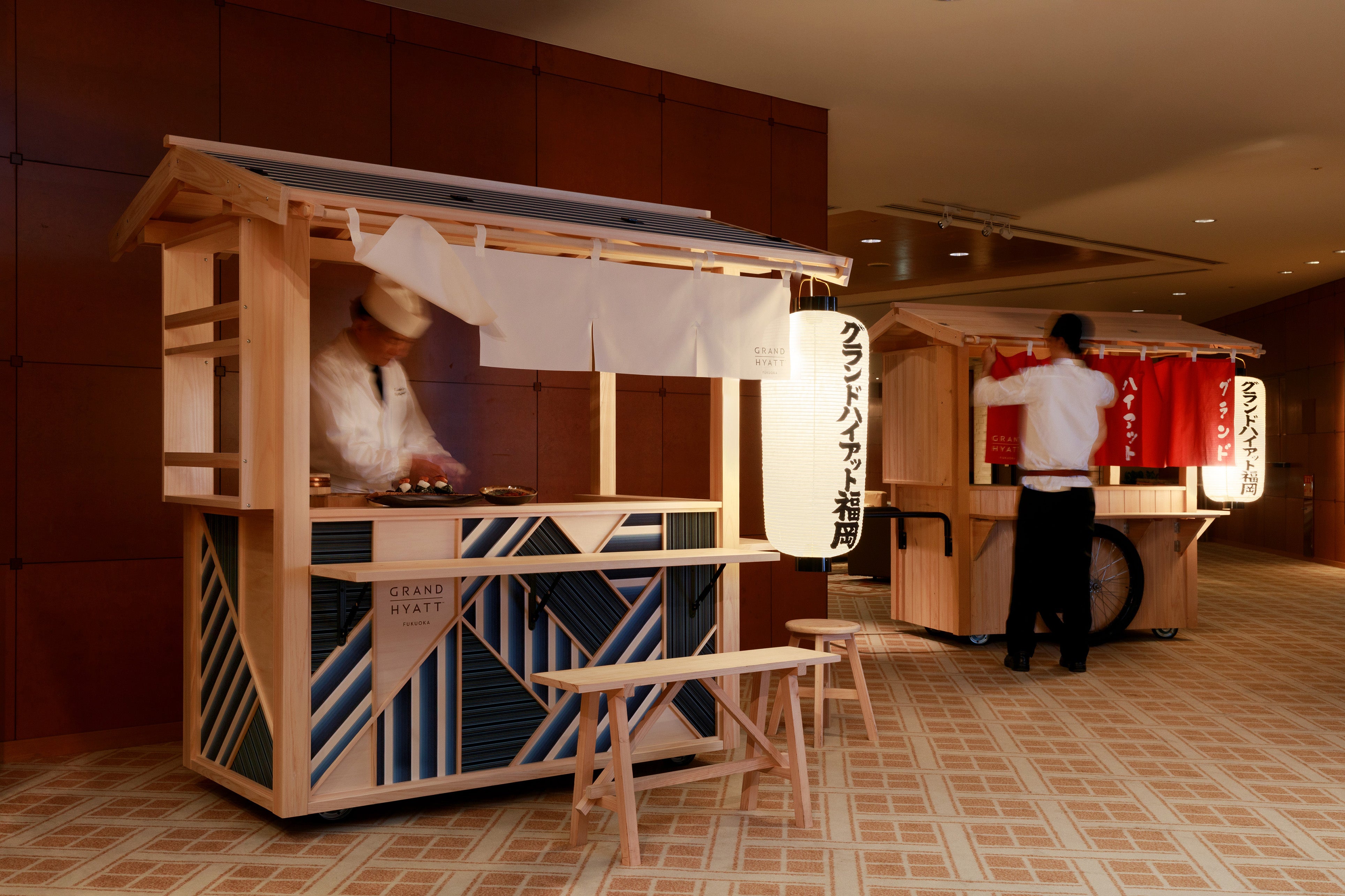 今回の屋台では、福岡・小倉の伝統工芸「小倉織」を現代に継承するブランド「小倉 縞縞」の生地を、屋台本体や屋根の意匠に取り入れました。グランド ハイアット 福岡が掲げる“モダンな和”の世界観と、小倉 縞縞が生み出す美しいたて縞の表情が調和するデザインに仕上げています。グランド ハイアット 福岡の宴会を象徴する新たな存在として、多彩なイベントシーンで活用してまいります。