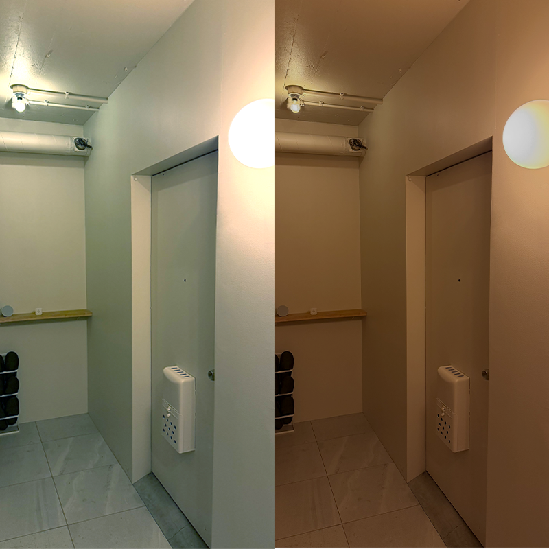 コンパクトなウォールウォッシャーが、テーブルランプよりも光の広がりが広く、鮮やかなグラデーションを表現していることが分かります。