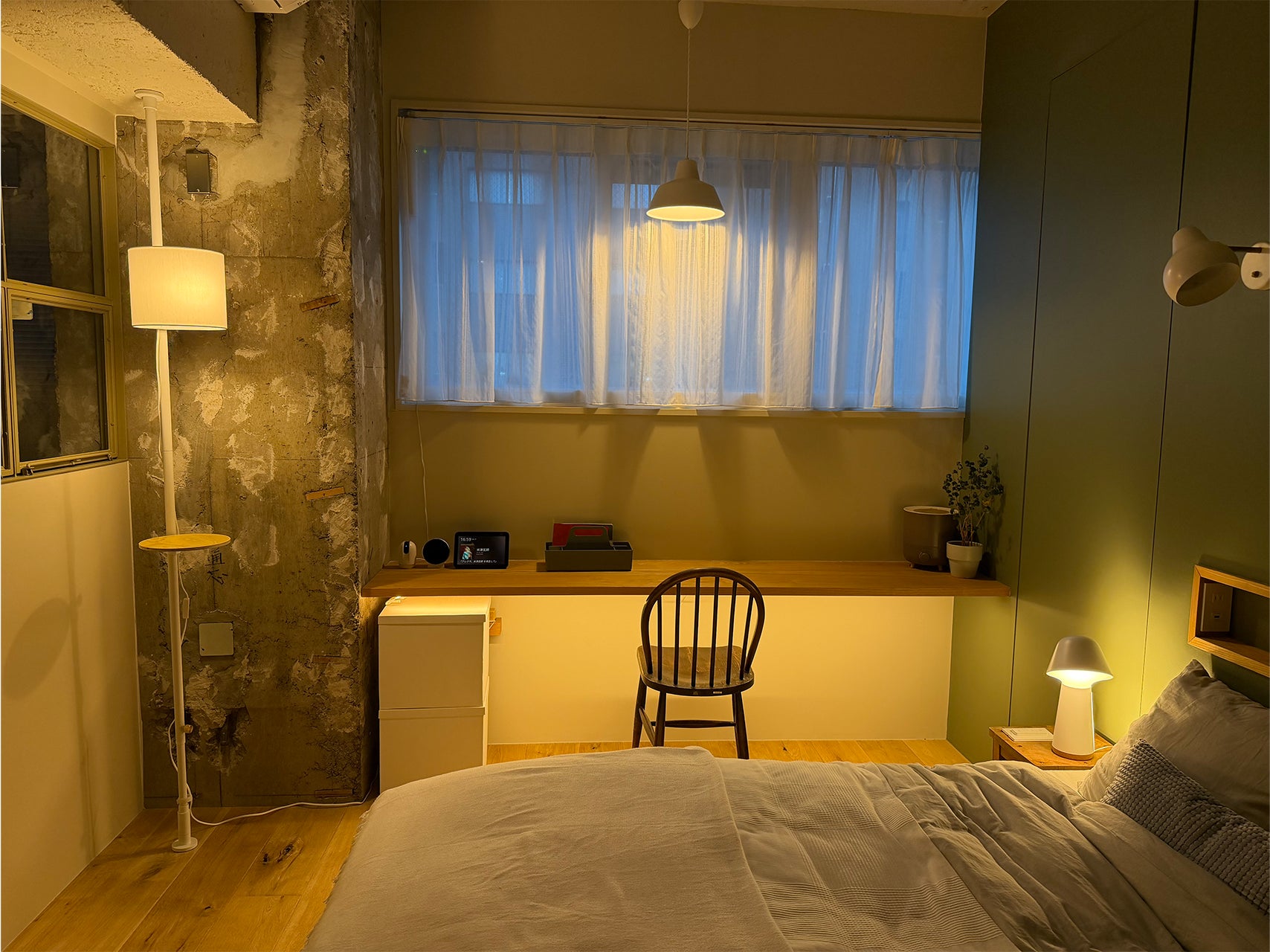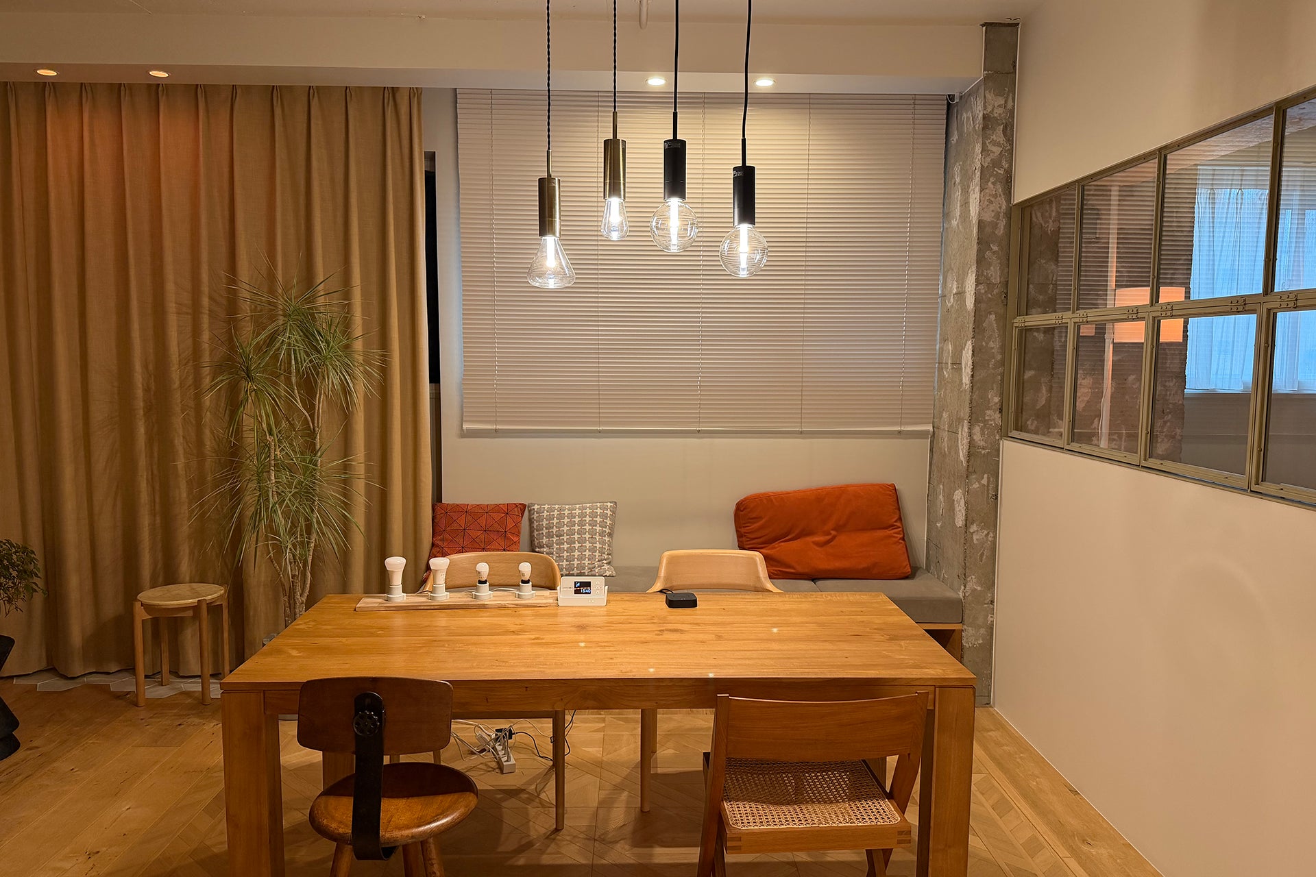 画像左の照明は、DRAW A LINE(平安伸銅工業)の「ファブリック フロアライト テーブルセット」にHueをセットしています。このように家の構造上、照明が設置できなかった場所への照明の取り入れ方もご紹介しました。