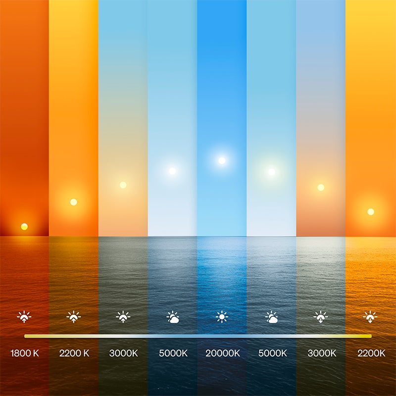 また、白色光が従来製品の2000~6500Kから1000~20000Kへとフルスペクトル対応となり、夕暮れのような深い朱色から、抜けるような青空の色まで再現が可能となりました。E26電球は2025年秋に発売を開始し、E17電球は2026年夏に発売を予定しております。