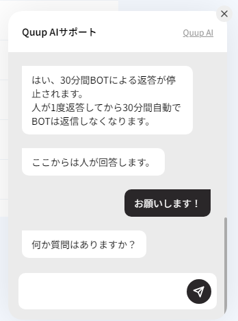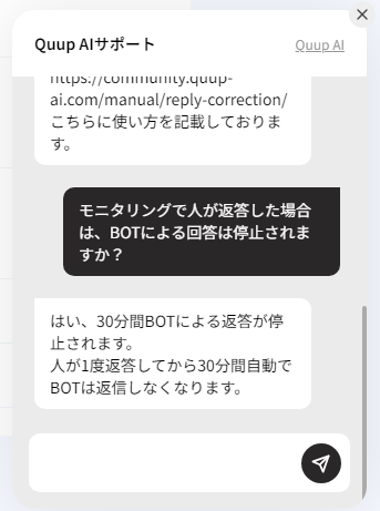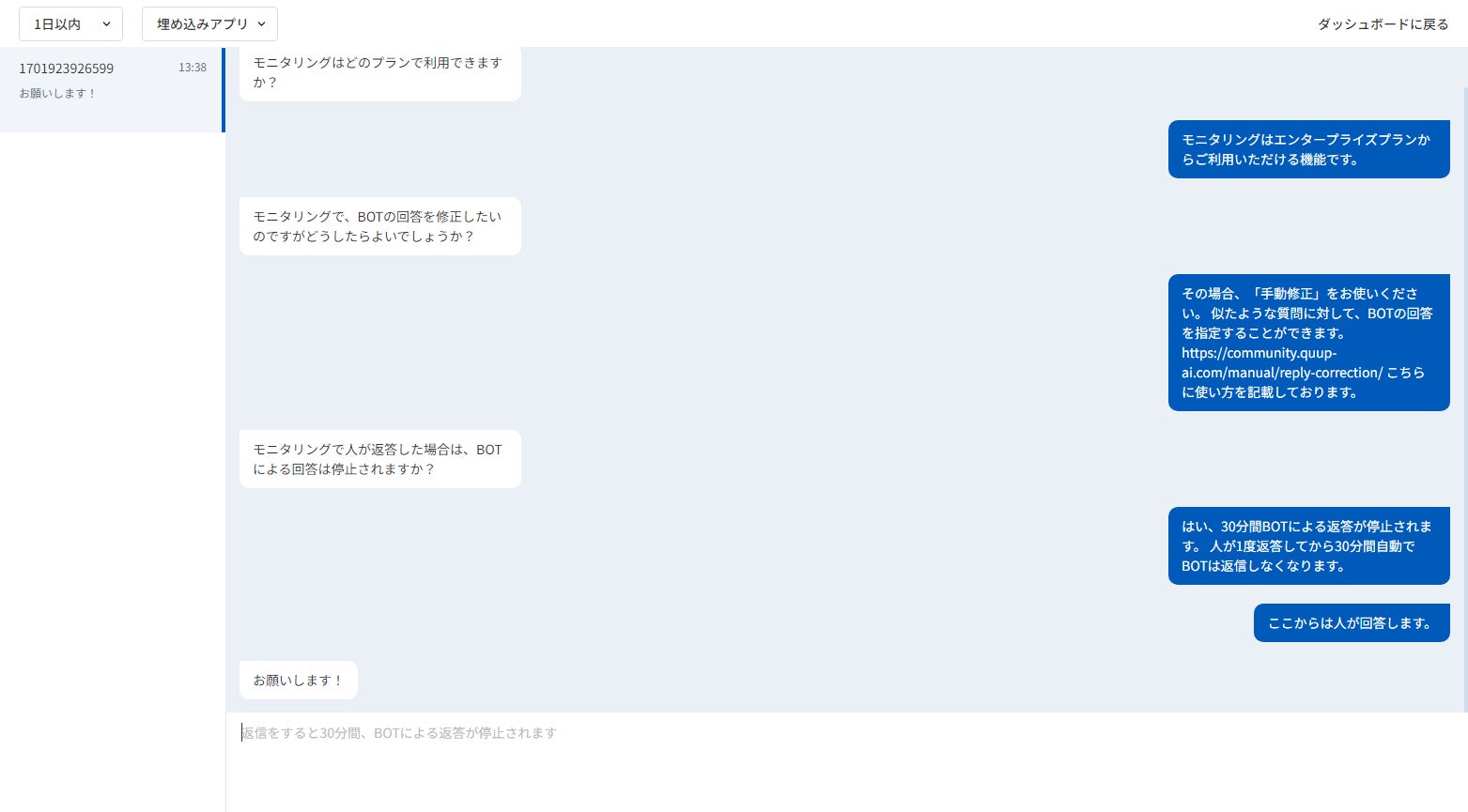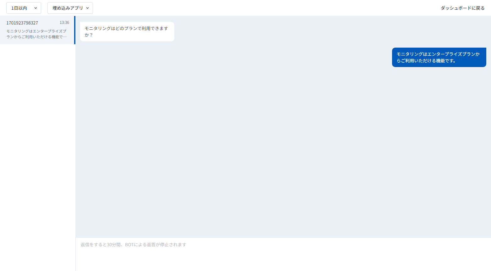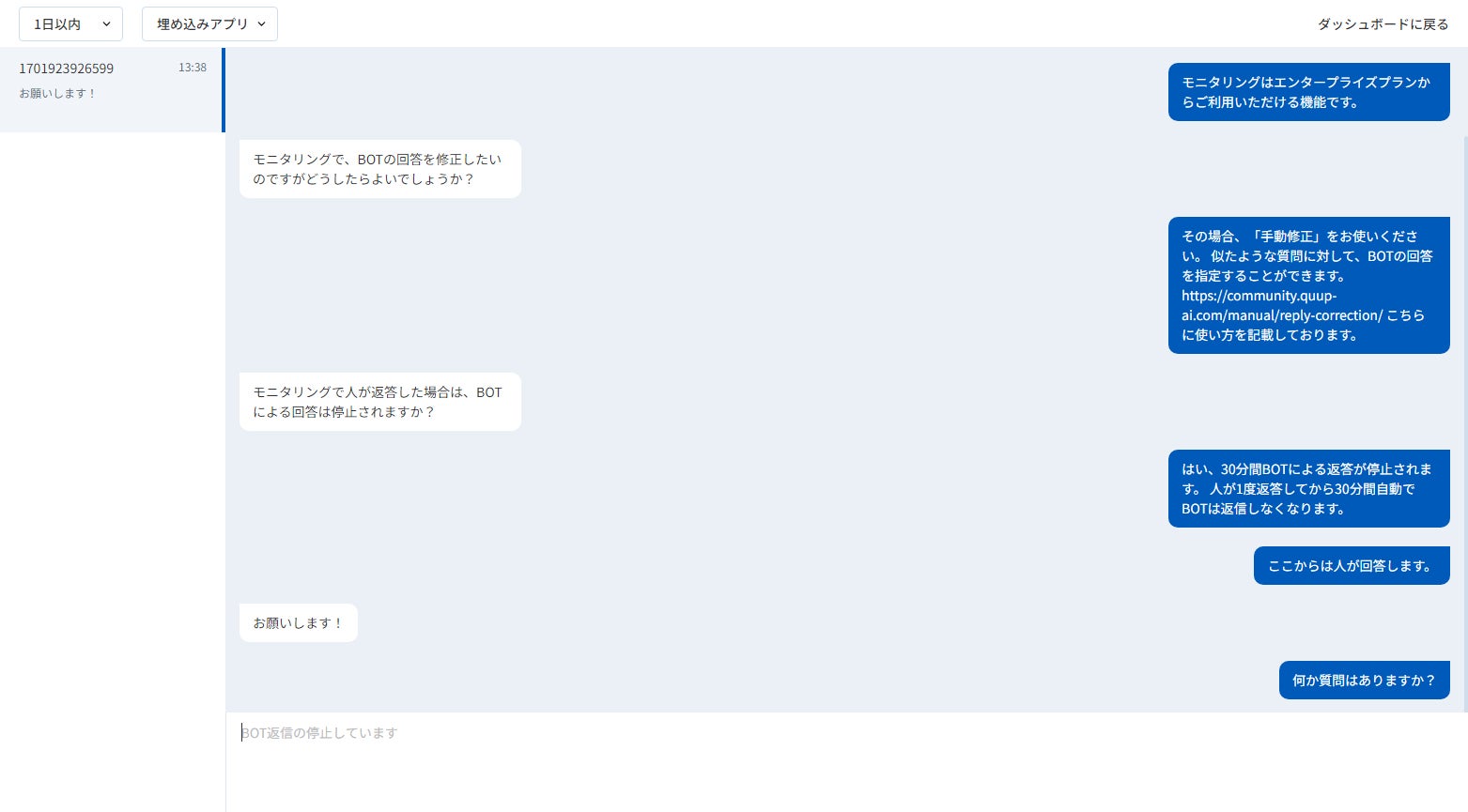 モニタリングすることで人が代わりに返答したり、BOTの回答を修正することができます