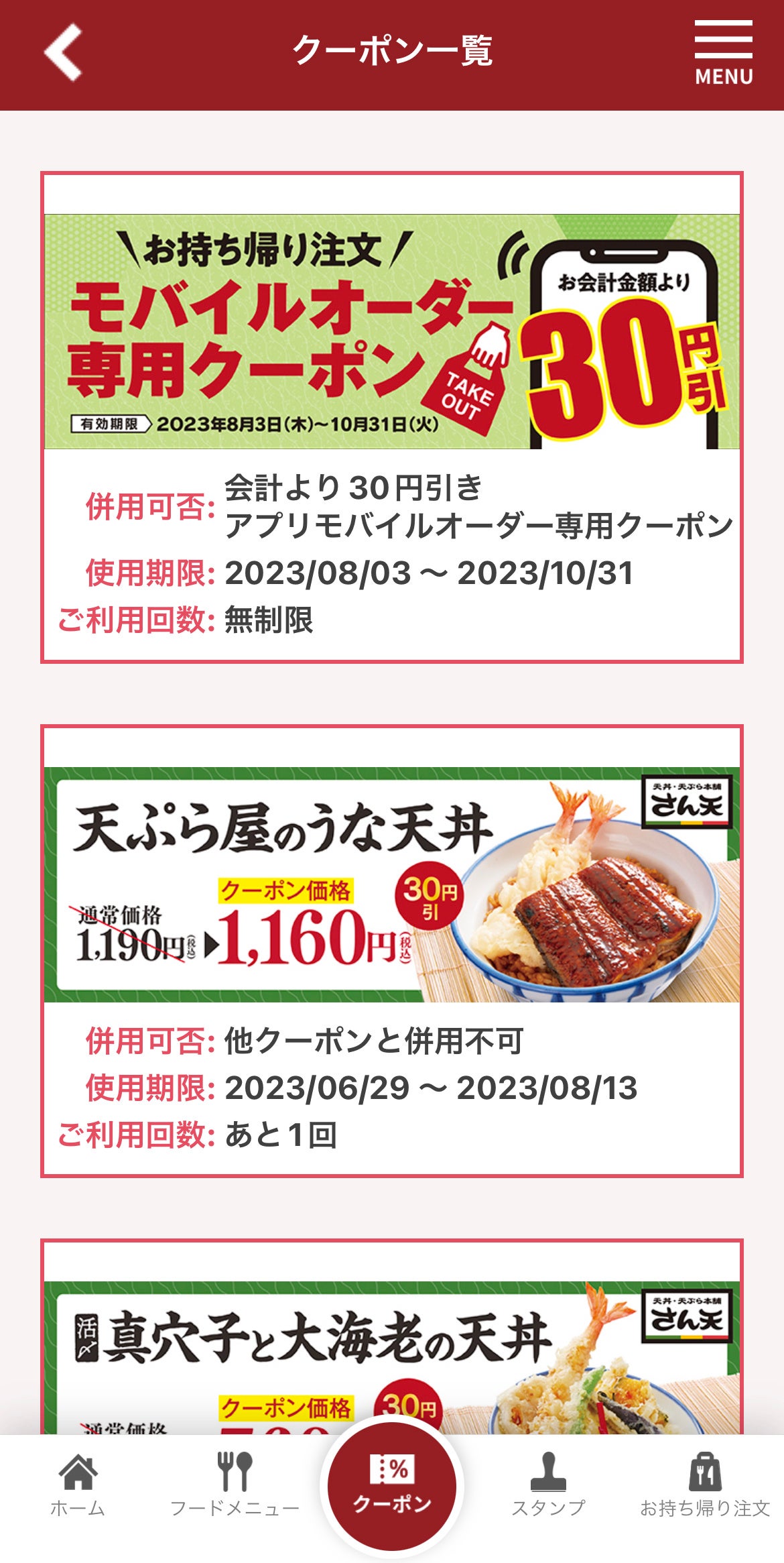 日常的にお得に、便利に使っていただける「天丼・天ぷら本舗 さん天」公式アプリは、最新メニュー情報を確認できたり、来店スタンプ機能や、クーポンなどの機能が充実いています。