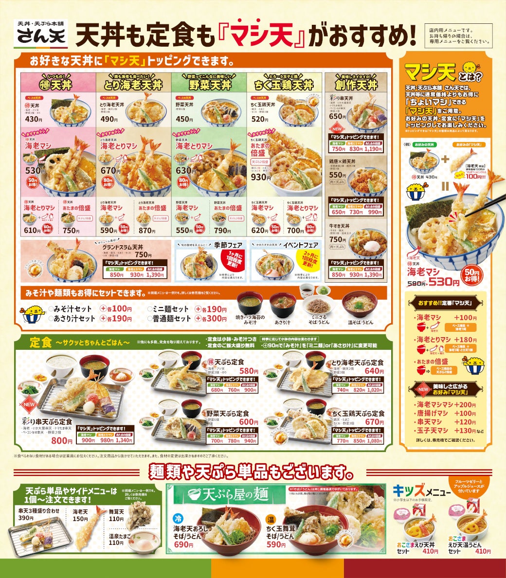 天丼・天ぷら本舗 さん天は「サクッとちゃんとごはん」をキャッチコピーに、早い・安い・熱々をコンセプトとした、天丼・天ぷら専門店です。