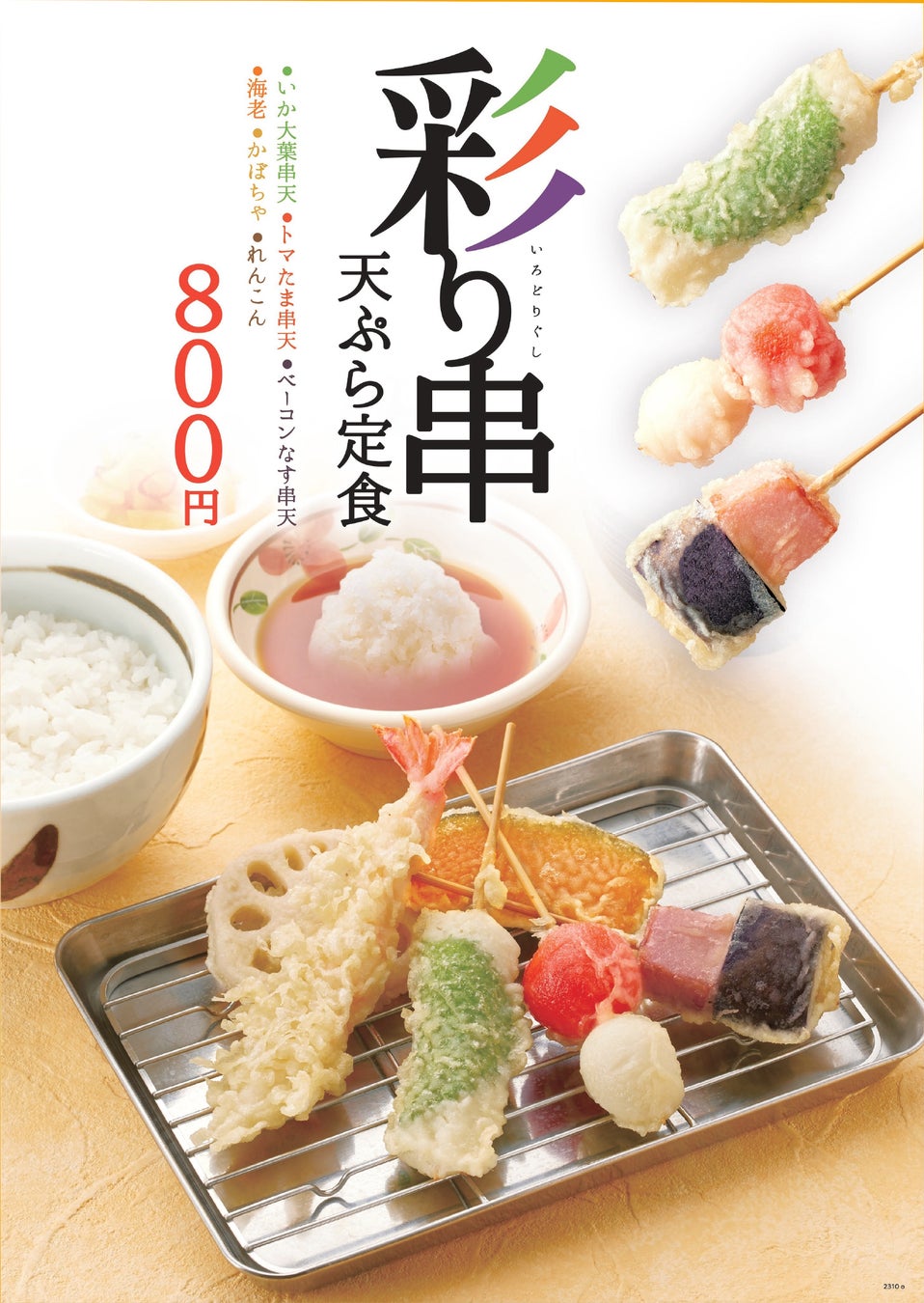 新商品の「彩り串天ぷら定食」や新たな種類の「マシ天」も新登場します。
