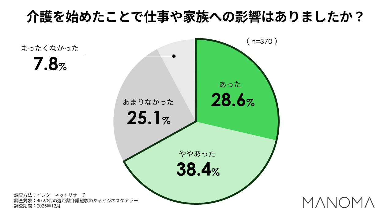 介護を始めたことによる仕事や家族への影響は、「あった」「ややあった」と回答した方が67%、3人中2人は介護負担が仕事や家族に影響しています。