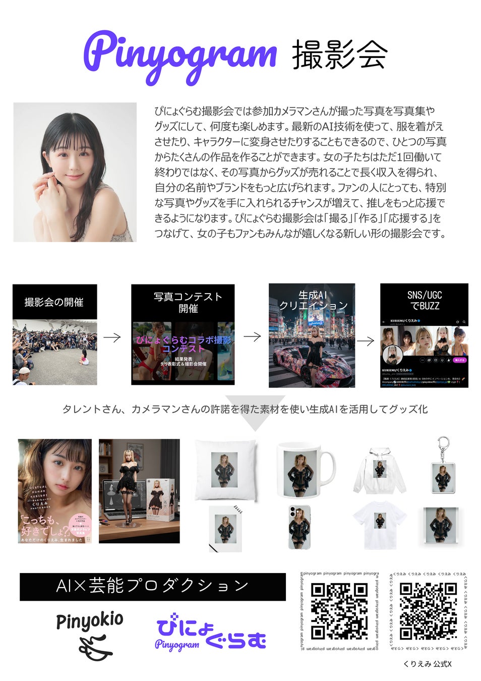 「Pinyogram撮影会」は、SNS時代における“可愛い”の表現をアップデートする試みとして、撮影を通じて女性クリエイター・モデル・ファンが対等に表現を楽しめる場をつくることを目的にしています。くりえみ自身が主宰として企画・監修し、モデルたちの肖像権・著作権・収益還元の仕組みを整備することで、「女の子たちの権利を守る新しいエンタメの形」を提示します。 また、撮影会を中心に、フォトグッズ・デジタルアイテム・アパレルなどのIP展開も予定。単なる撮影イベントに留まらず、参加クリエイターの才能が持続可能に循環する仕組みを目指しています。 「“かわいい”を守ることは、“自分らしさ”を守ること。Pinyogramを通して、表現する女の子たちがもっと自由に、自分の価値を発信できる場所をつくりたい。」