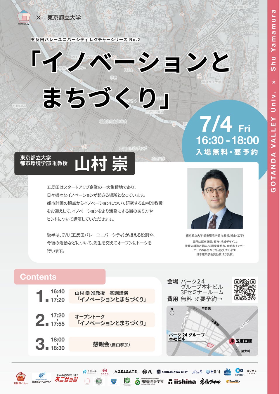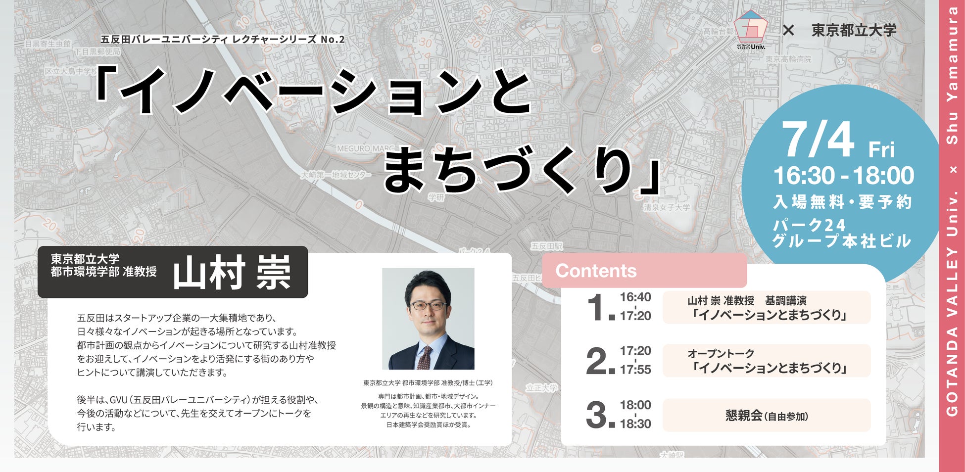 株式会社久米設計(本社所在地:東京都江東区潮見2-1-22)が参画する五反田バレーユニバーシティと東京都立大学山村崇准教授が共同し『イノベーションとまちづくり』の講演を開催します。