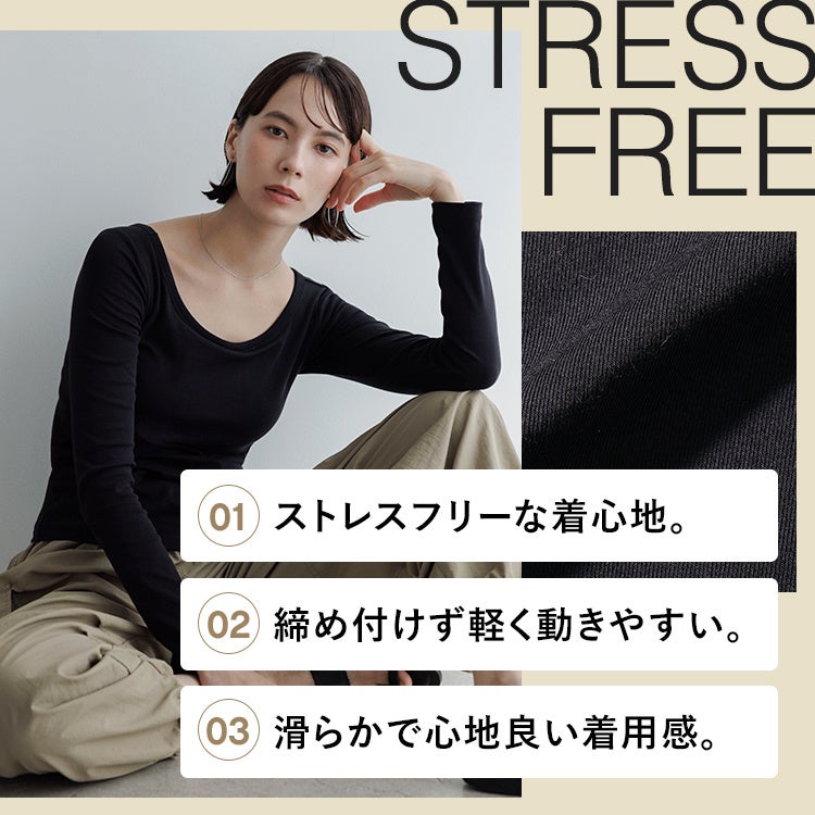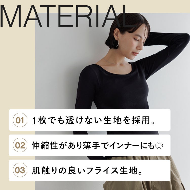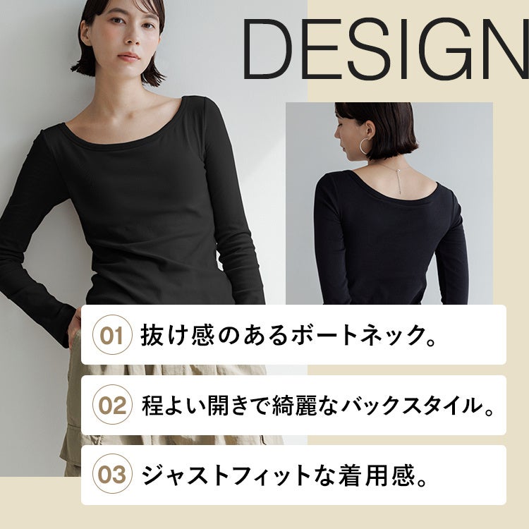 さらに、肌に優しいフライス生地と絶妙な丈感により、スタイリングがしやすく、1枚で「高見え」するシルエットを実現しています。袖丈や首元の開き具合、さらに丈感も計算されており、バックスタイルまで美しい仕上がりです。