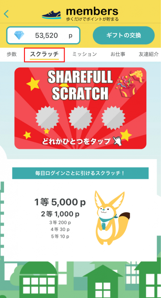 「シェアフルmembers」に登録するだけで、『シェアフル』を使えば使うほどポイントが貯まり、さまざまなPayに交換できます。例えばその日歩いた歩数に応じてポイントがもらえたり、スクラッチくじを引くことでポイントがもらえたりすることができます。