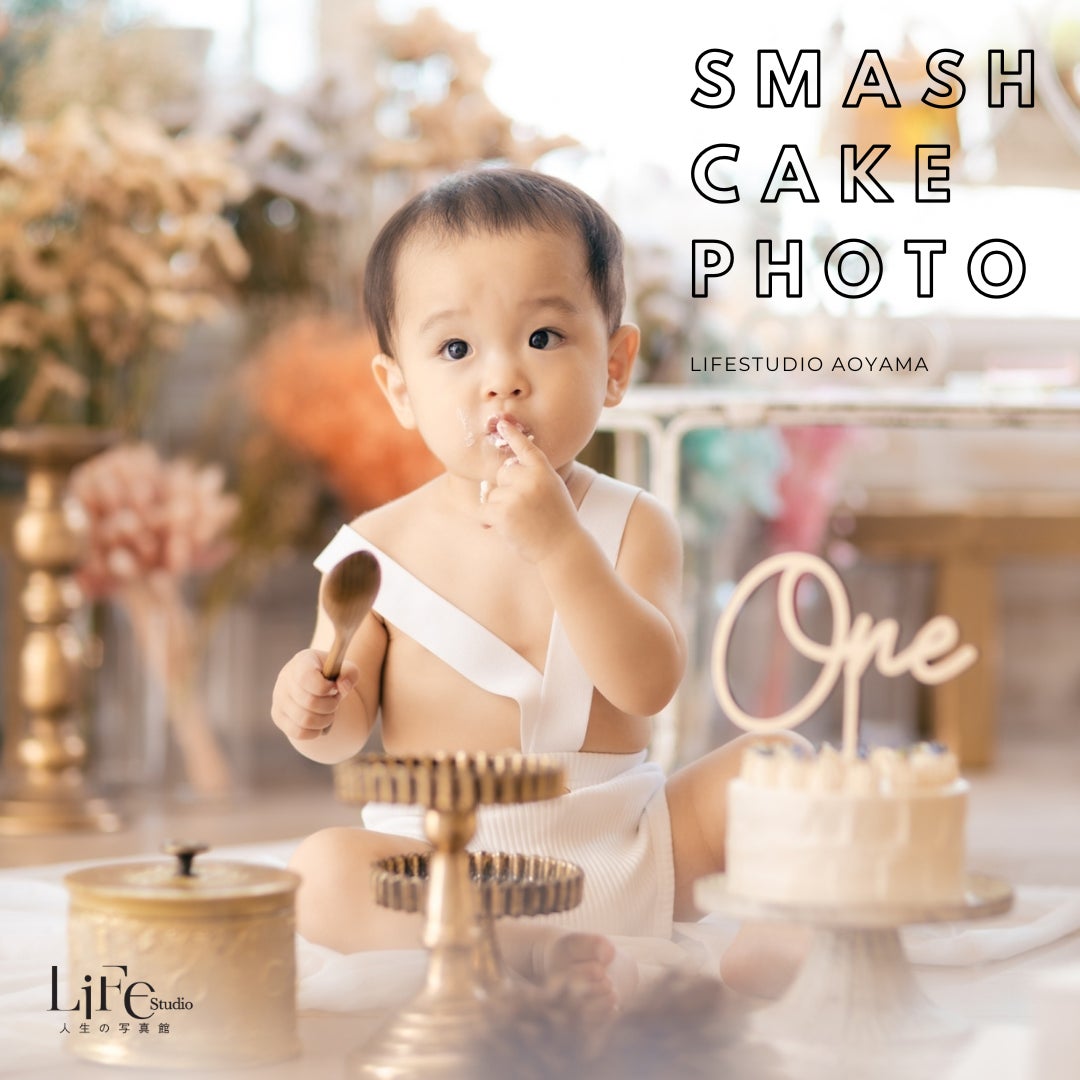 ライフスタジオ青山店で、大人気のスマッシュケーキ撮影。大好評につき、衣装や小物の追加、撮影ブースにも手を加え、もっとおしゃれに、気軽に1歳のバースデーをご家族みんなで楽しもう!