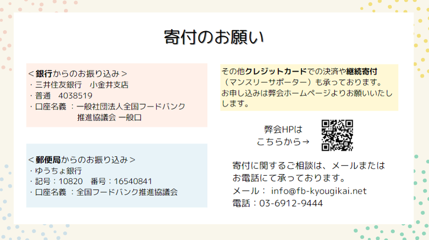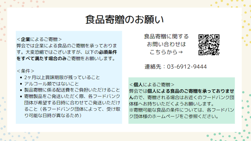 本プロジェクトの実施には、多くの企業・団体・個人の方からの食品の寄附や活動資金の寄付などのご協力が必要です。子どものいる困窮世帯へ、より多くの支援が届くよう、皆様のご協力をよろしくお願いいたします。