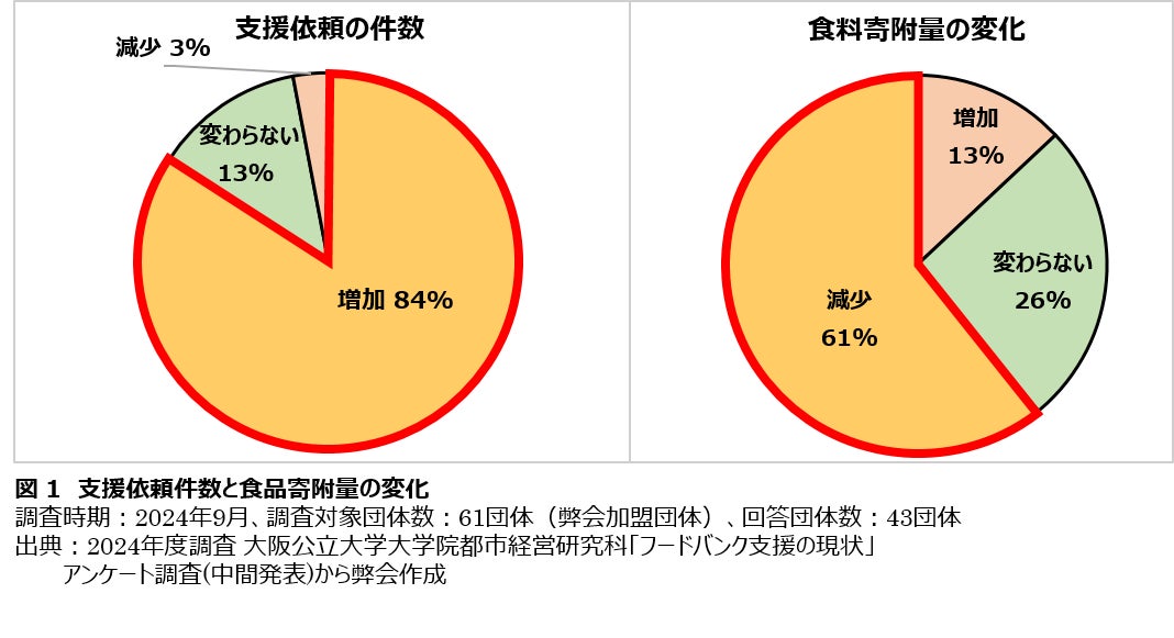 一方で、フードバンク団体による食料支援は、地域のすべてのニーズを十分にカバーできていないのが現状です。弊会の加盟フードバンク団体を対象に昨年実施したアンケート調査では、8割以上の団体で困窮世帯からの食料支援要請が増加している一方で、6割のフードバンク団体では食品の寄附が減少していることが明らかになりました(図1)。